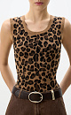 A knitted top with a jacquard pattern imitating a leopard's coat. The model has a fitted silhouette, is sleeveless, and features a round neckline. The edges of the garment are ribbed.