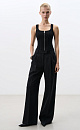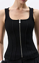 A viscose knitted corset with a dense knit. The model is fitted, with vertical volume darts, without sleeves, with a square neckline. The product has a zipper along the entire length. It is unlined.