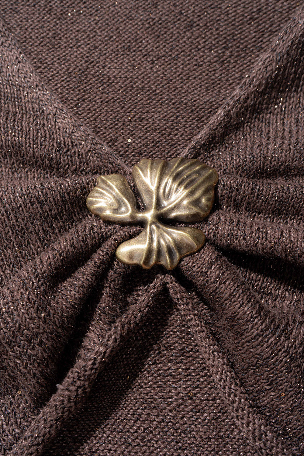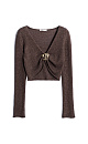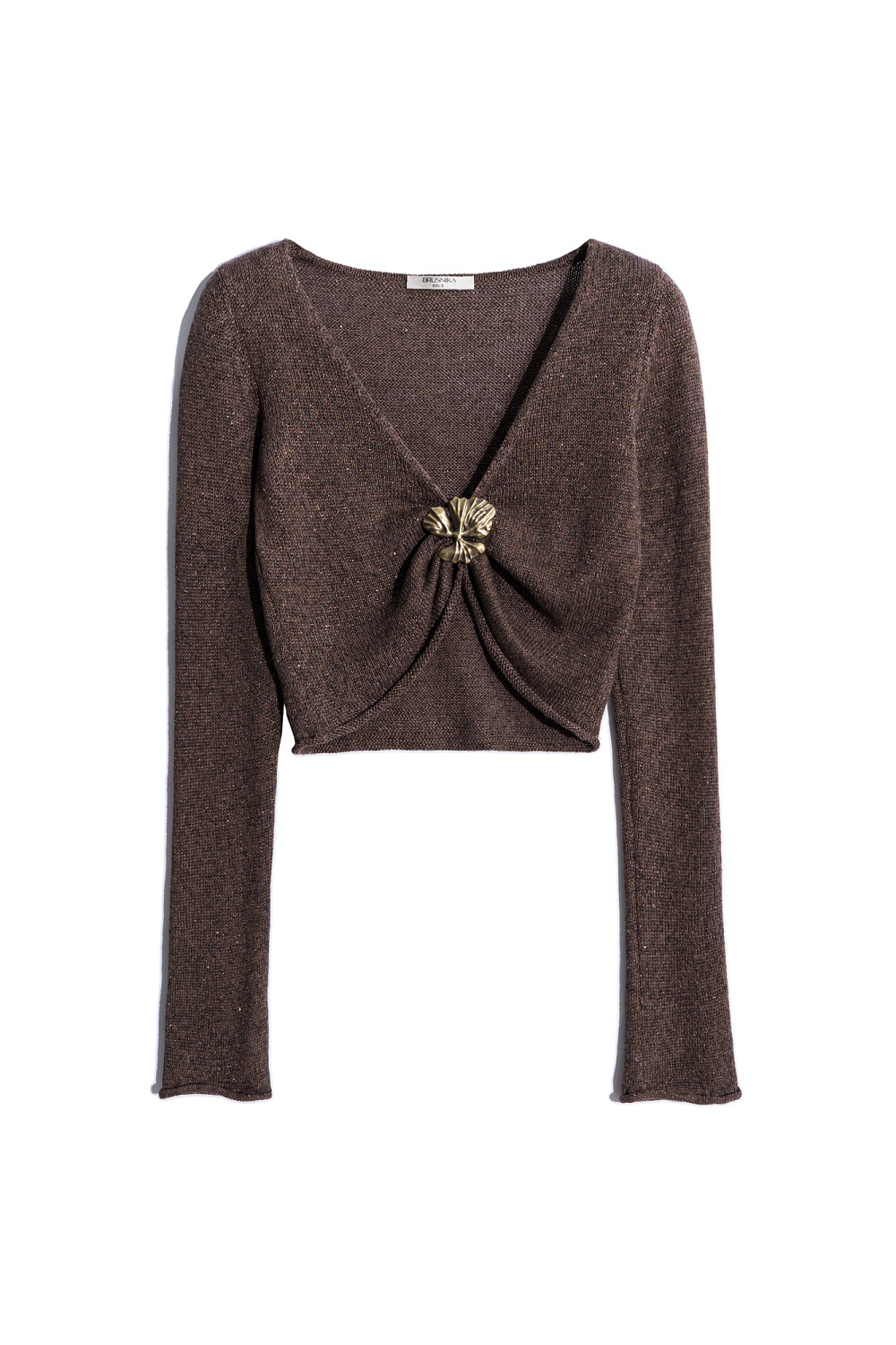 Knitted top made of linen with lurex. The model features a cropped silhouette with long sleeves, rolled cuffs, a deep V-neckline and an accent detail on the bodice.
