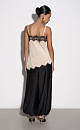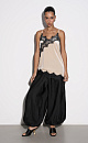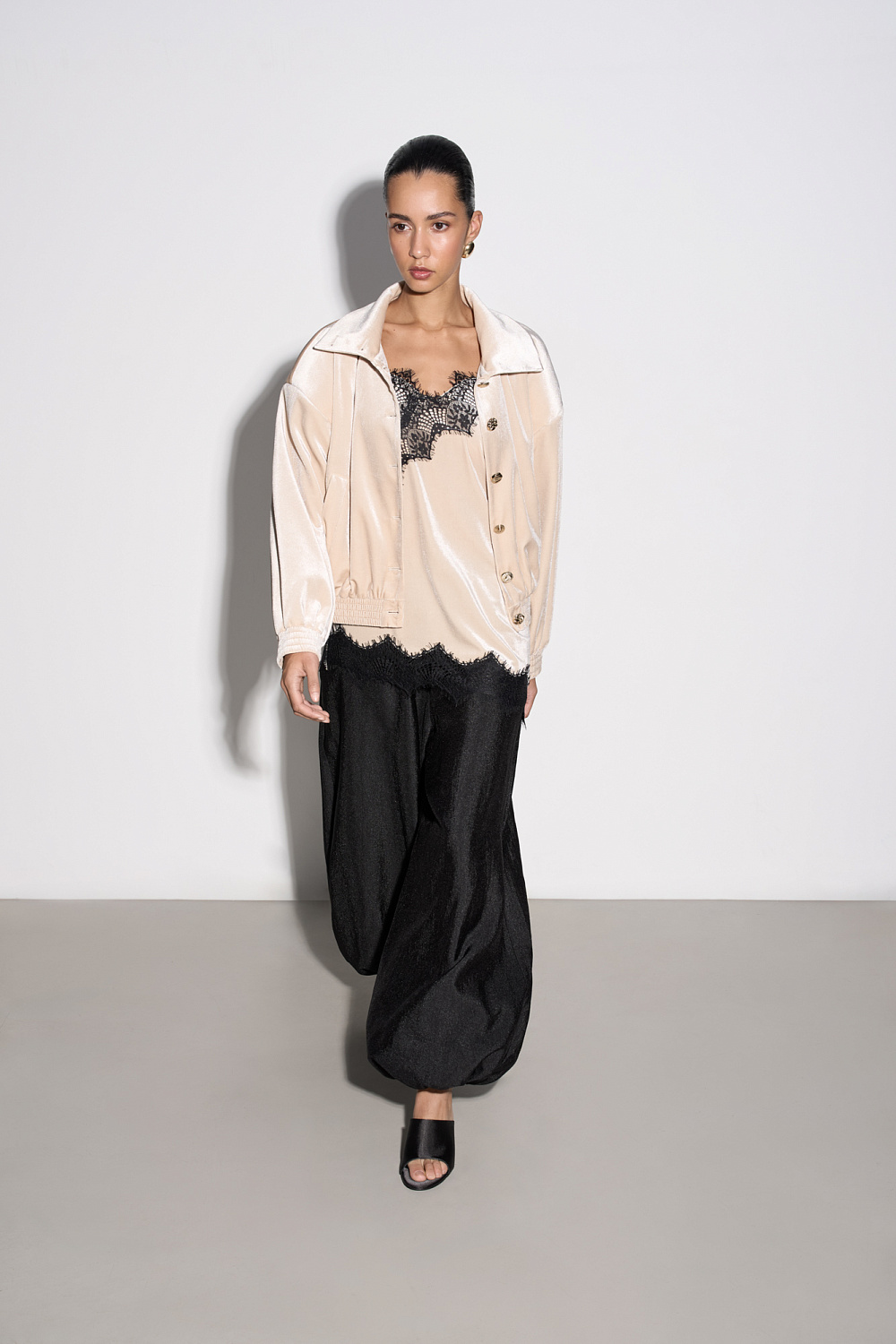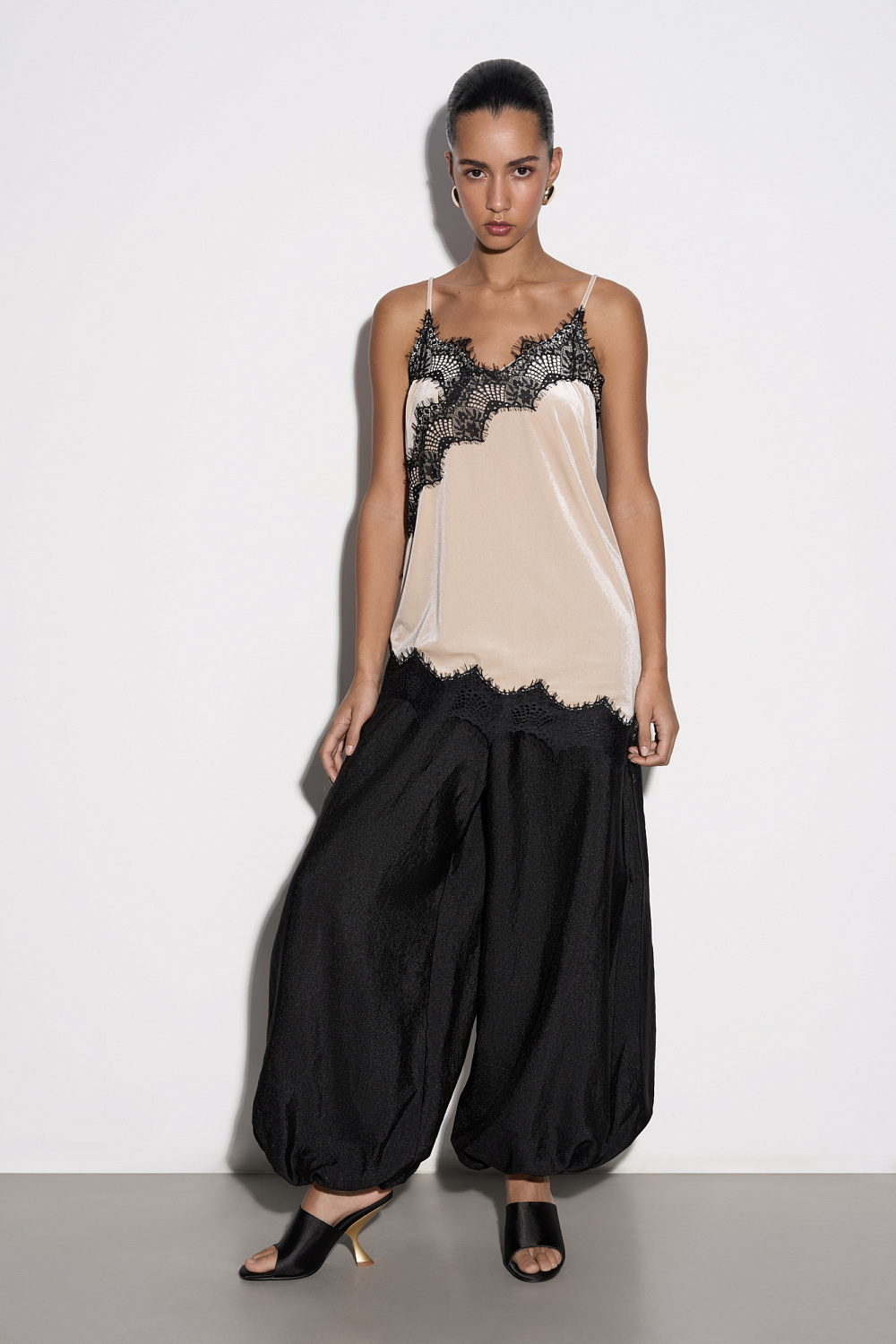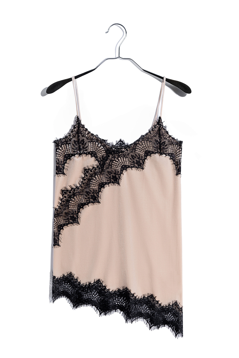 Top made of velvet viscose, decorated with thin lace. The model has an asymmetrical cut, with a deep neckline and thin straps.