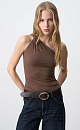 An asymmetrical modal top. A fitted silhouette model with an open shoulder, a twisted strap, and draping.