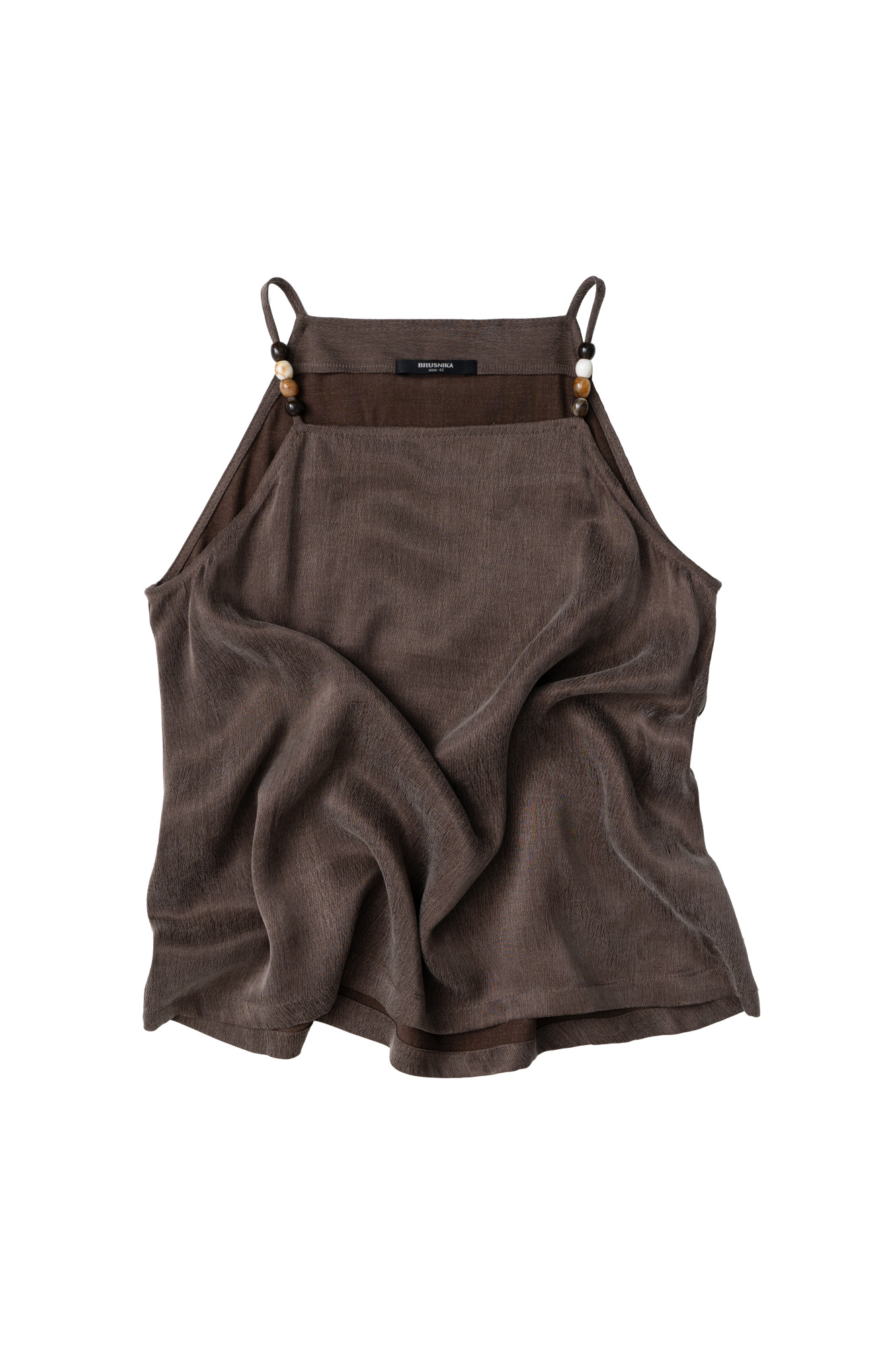 Cupra top. The model has a loose silhouette, with a straight, shallow neckline, and thin straps decorated with beads.
