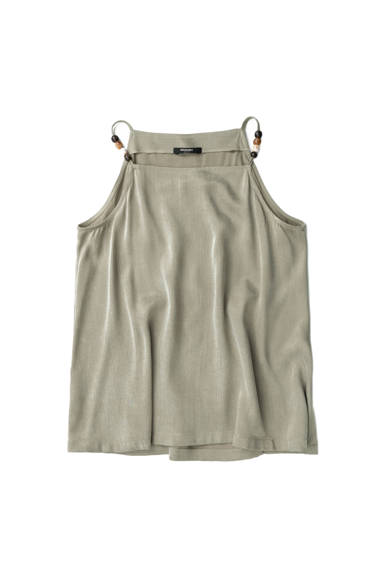 Cupra top. The model has a loose silhouette, with a straight, shallow neckline, and thin straps decorated with beads.