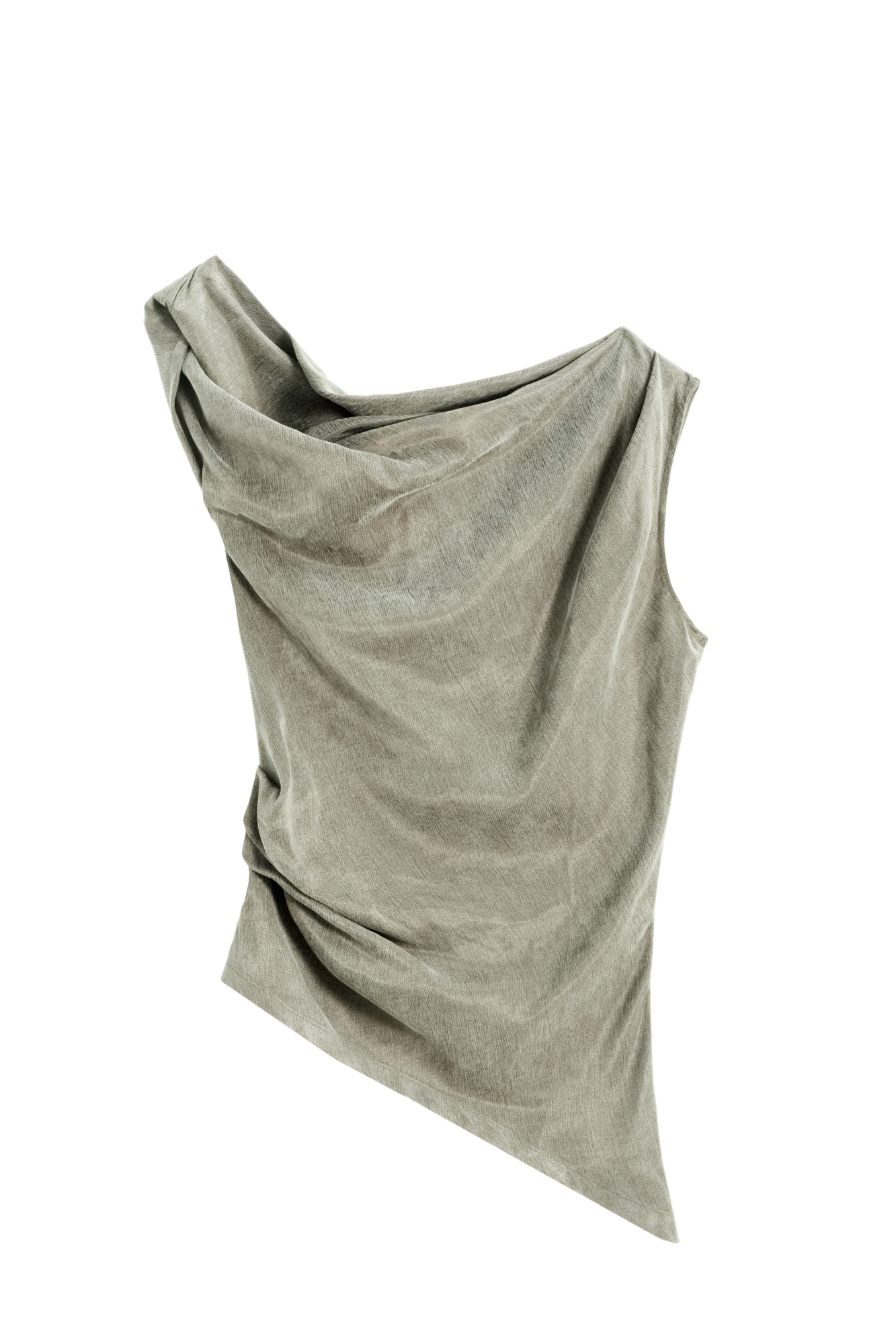 Top from koupra. Model of a free asymmetrical silhouette, with an emphasis on the shoulder, short sleeves, draping at the waist and soft folds.
