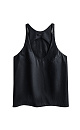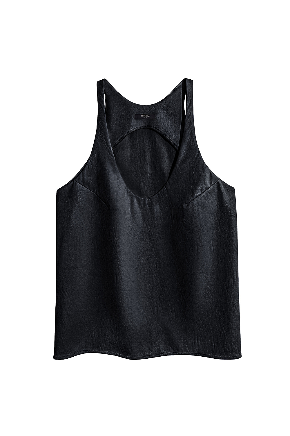 Textured eco leather top. The model has a loose silhouette with thin straps and a deep neckline.