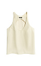 Textured eco leather top. The model has a loose silhouette with thin straps and a deep neckline.