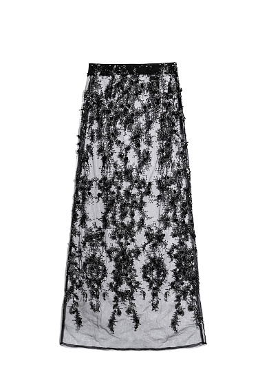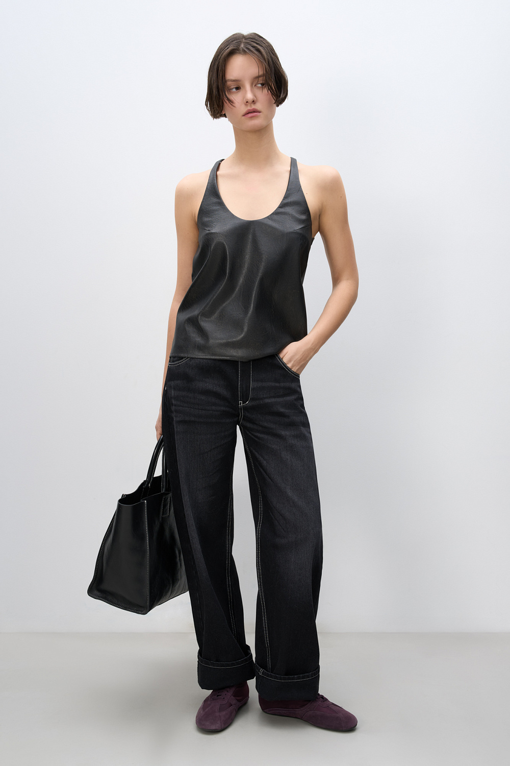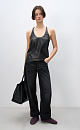 Textured eco leather top. The model has a loose silhouette with thin straps and a deep neckline.