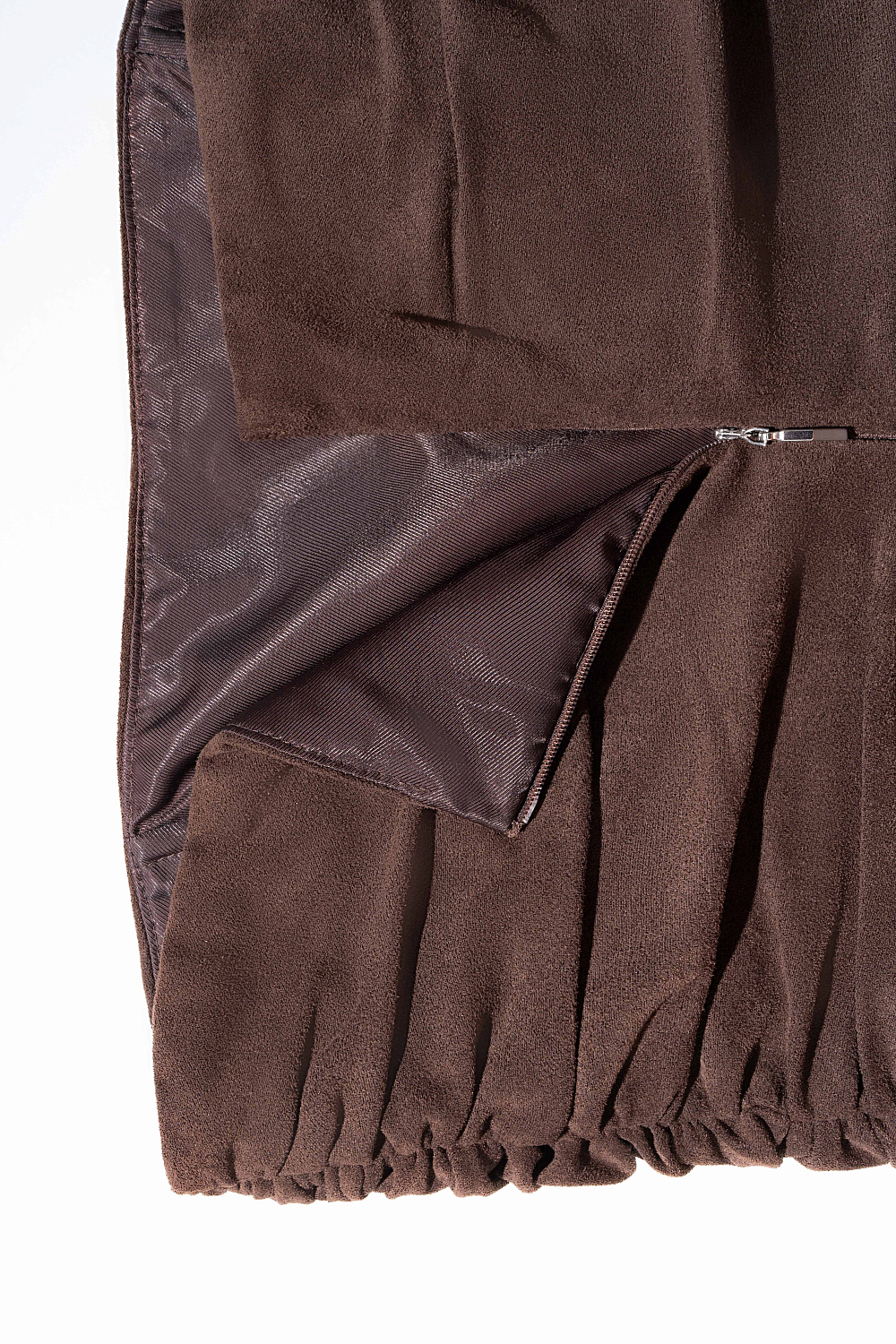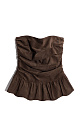 Corset made of fabric with an imitation of the appearance and properties of natural suede. The model has a fitted silhouette, strapless, with a peplum and drapery. Zip fastening on the back. The product is lined.