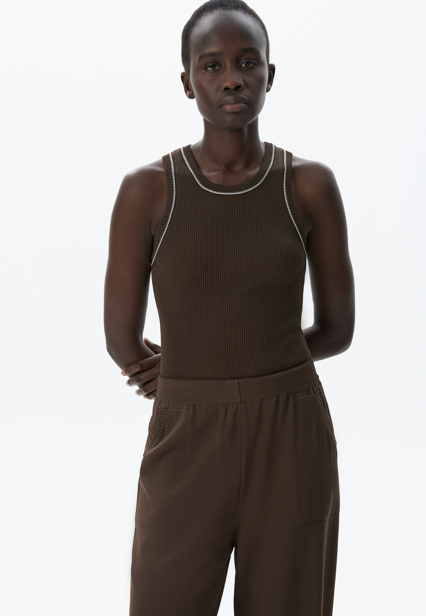 Ribbed sleeveless knitted top with piping detail.