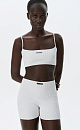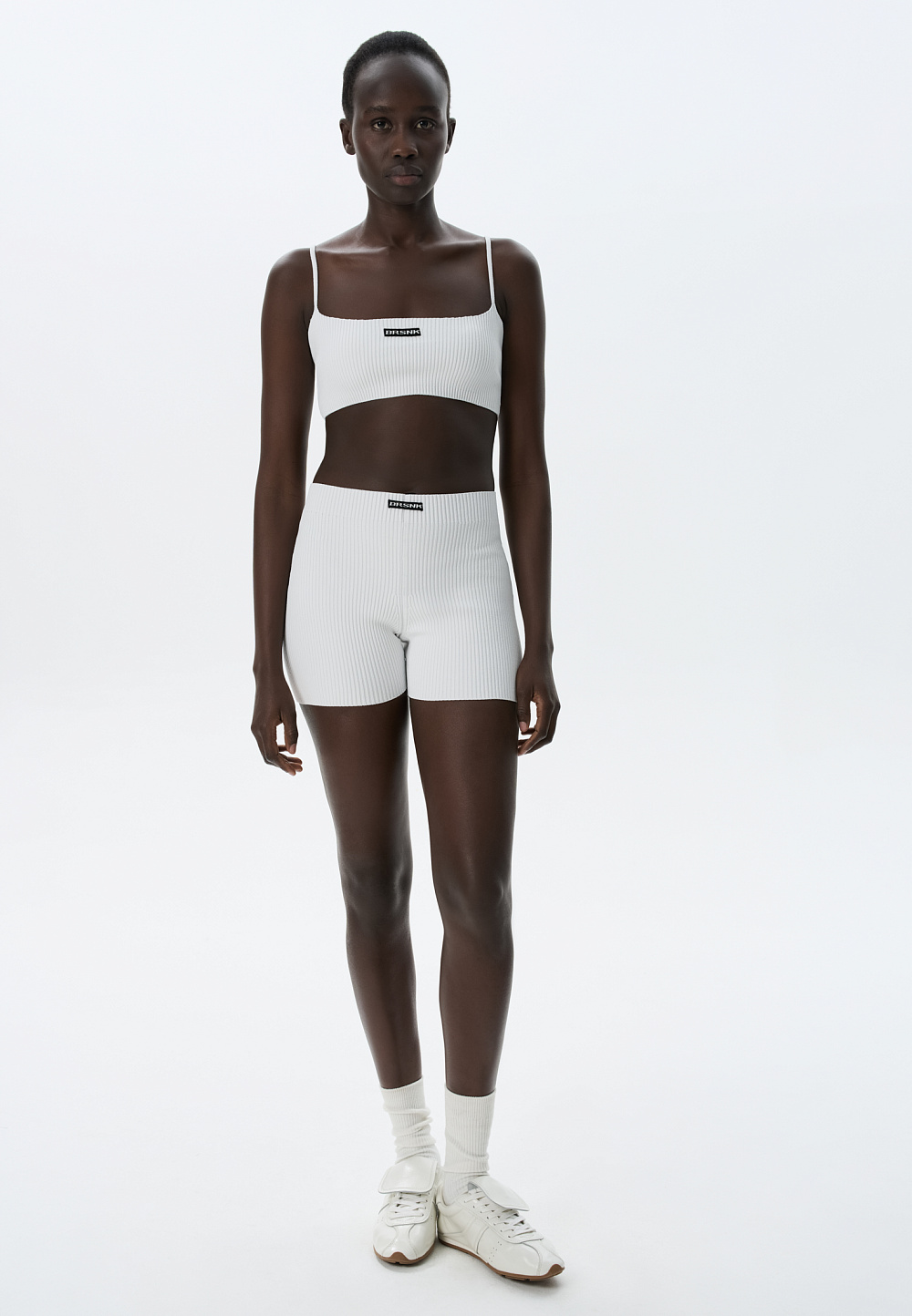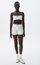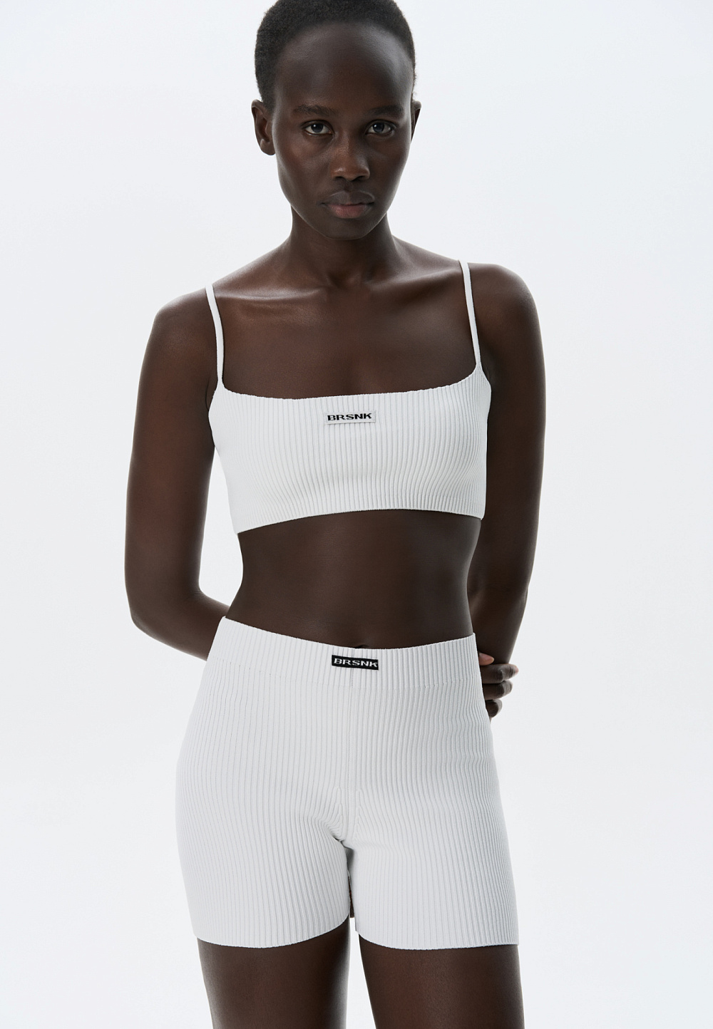 Knitted short top made of viscose in a sporty style. The model is made in a ribbed pattern with thin straps. Branded jacquard on the chest. You can complement the look with shorts in the same style.