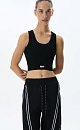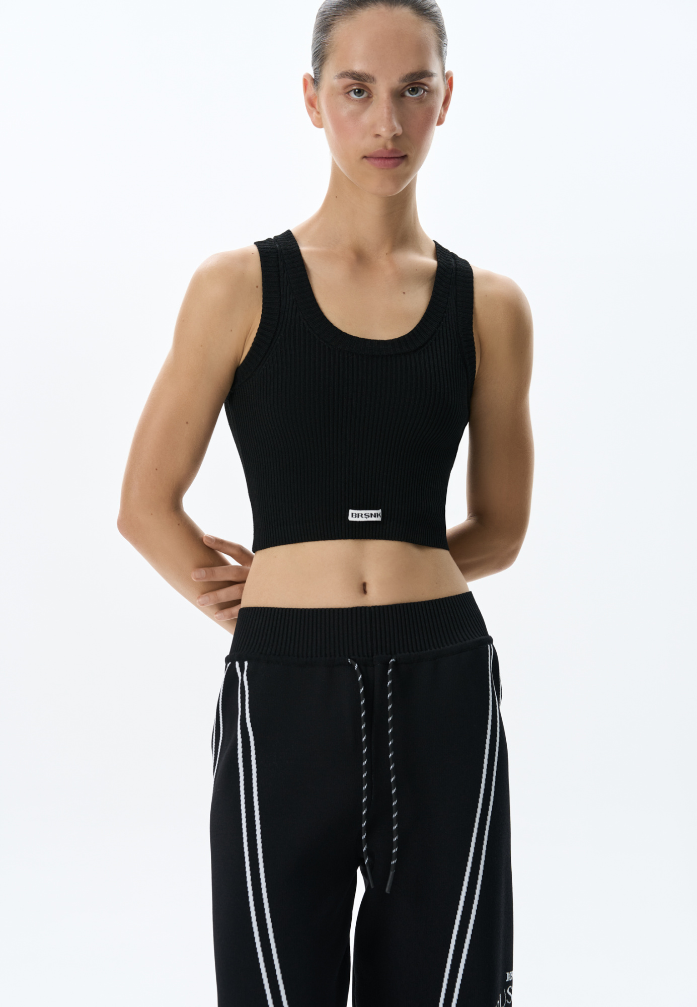 A viscose knit short top. The model is fitted, sleeveless, and has a U-neck. It is ribbed and decorated with a branded jacquard on the front.