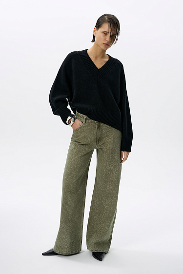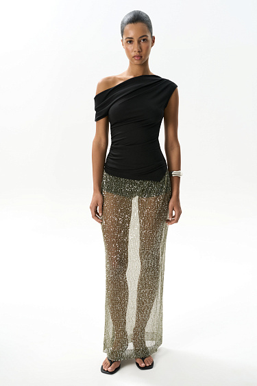 A transparent sleeveless top with a round neckline. The model is decorated with sequins.