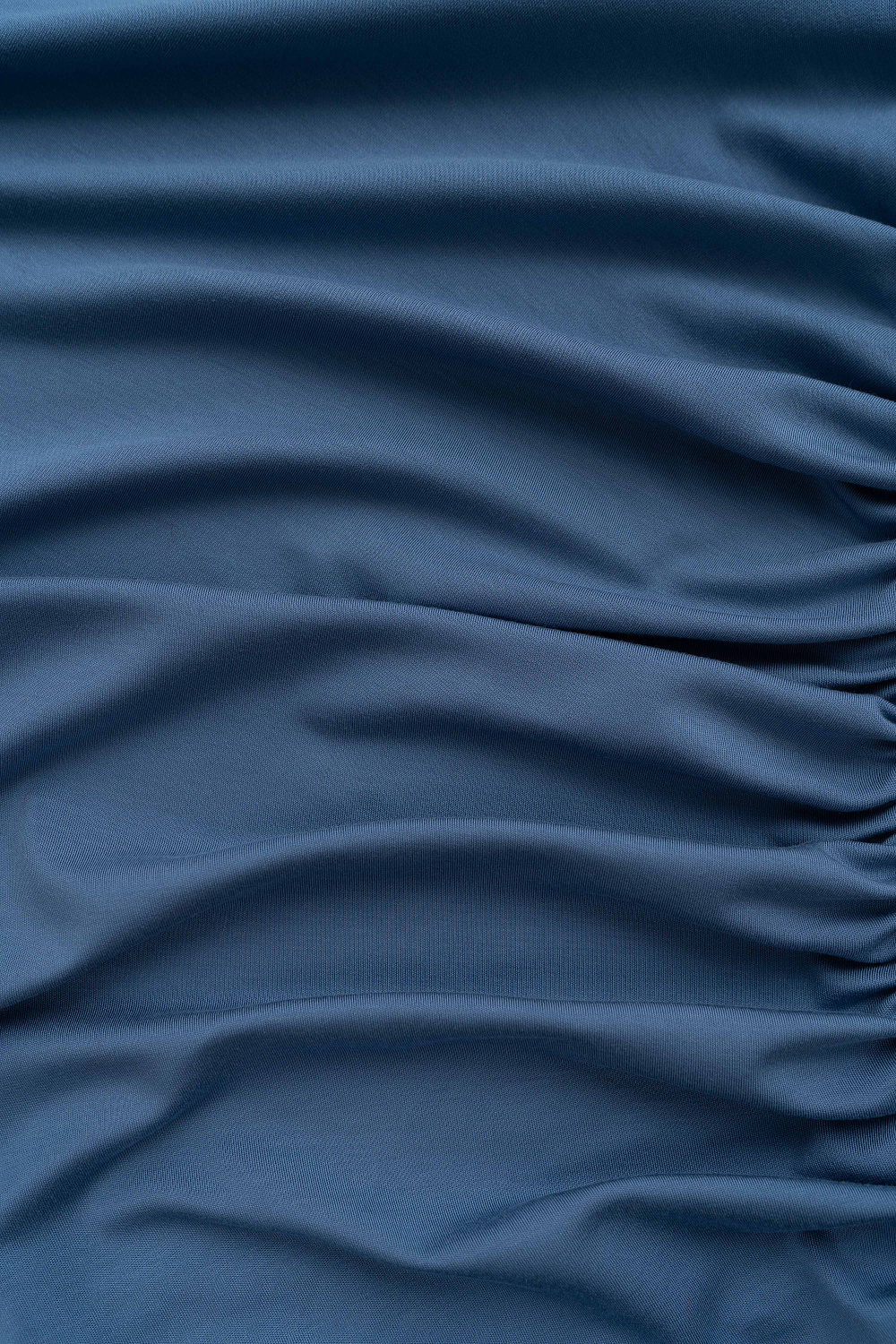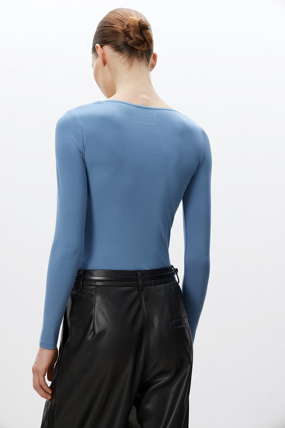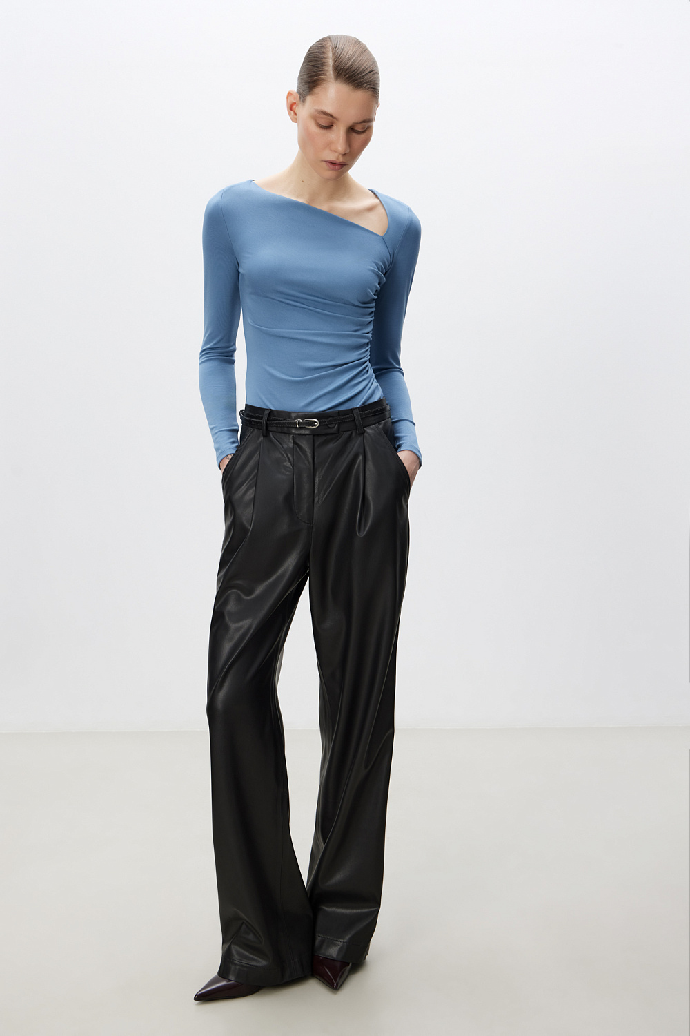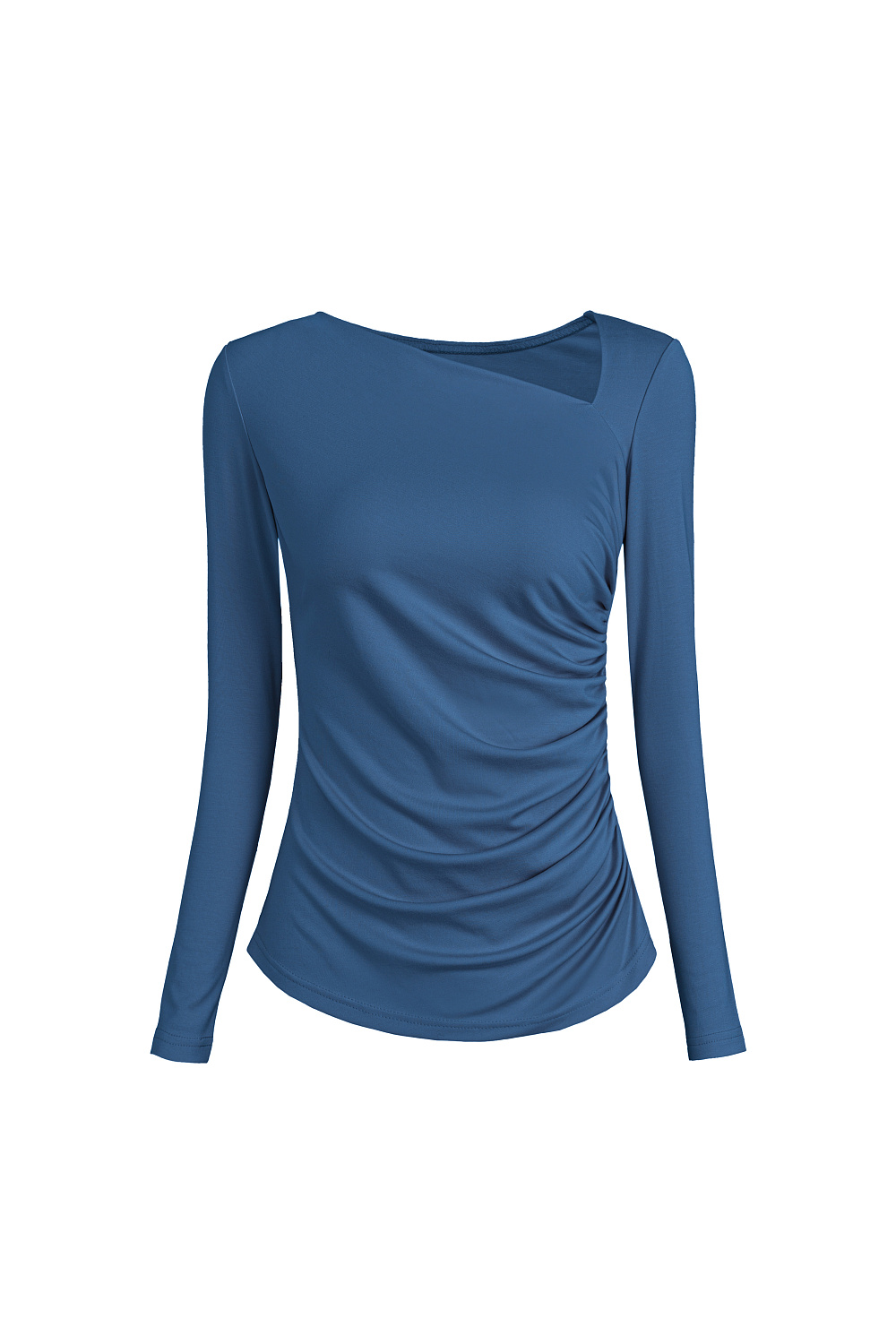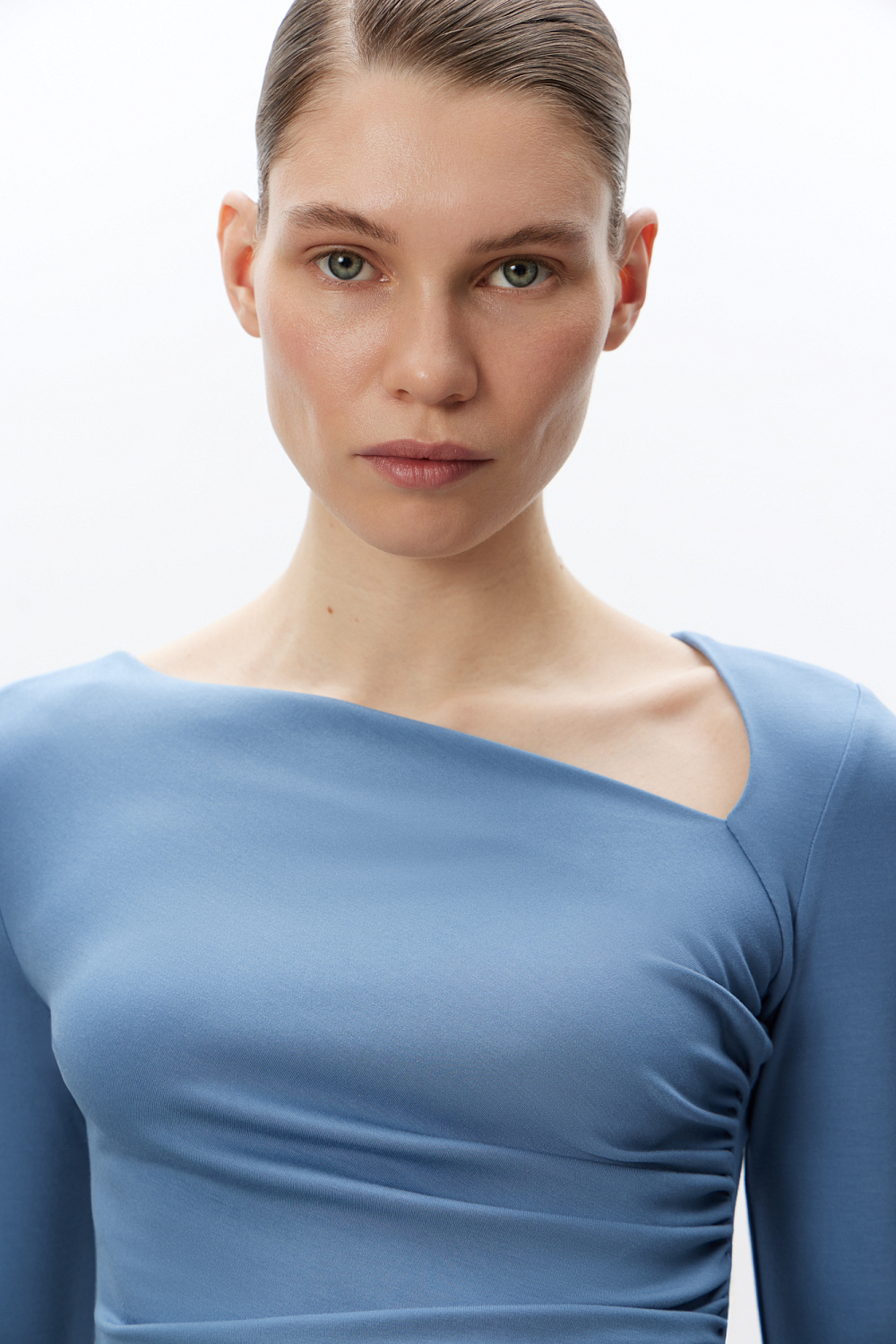 Longsleeve with an asymmetrical neckline. A fitted silhouette with draping on the side.