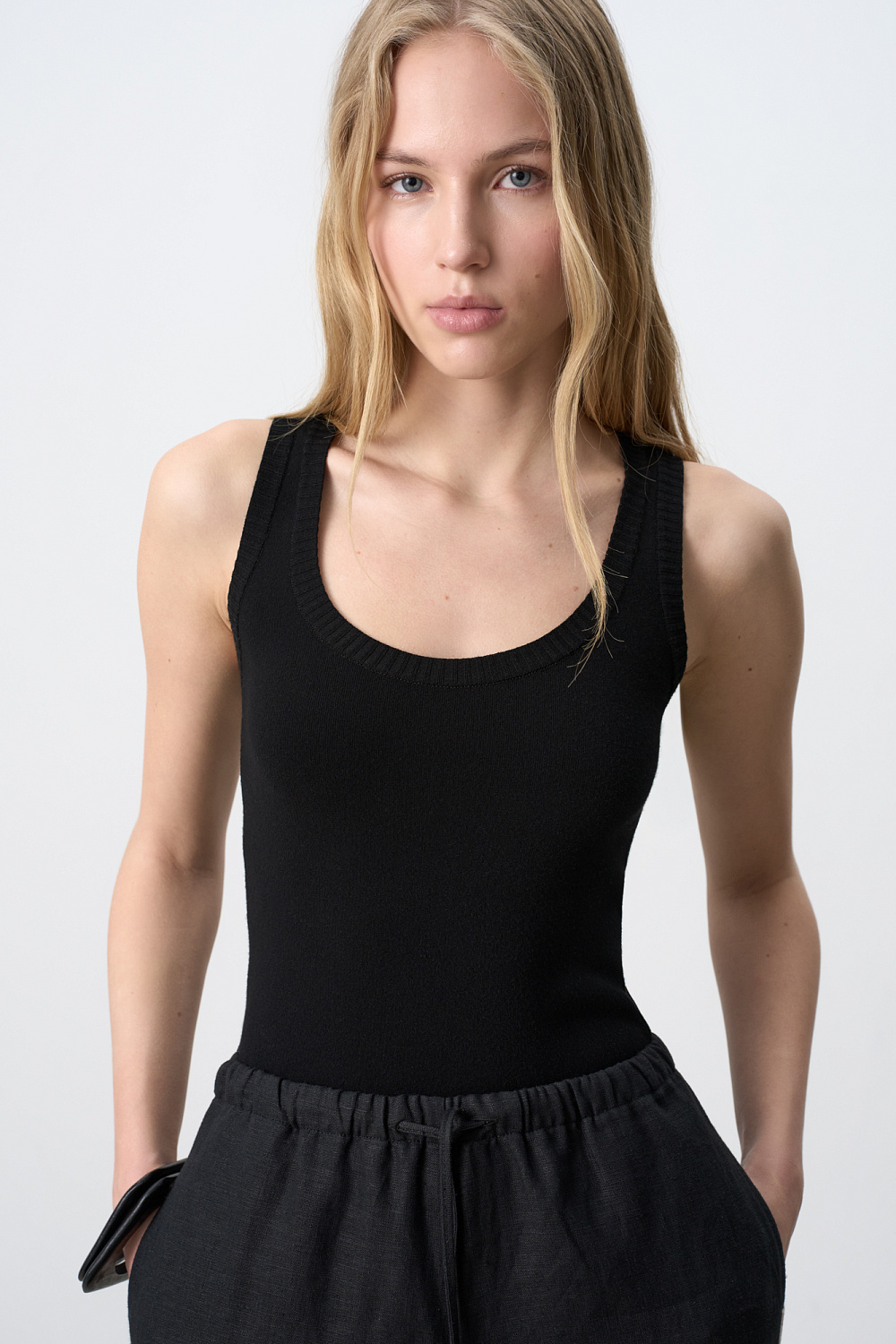 Knit viscose top with a round neckline and open shoulders.
