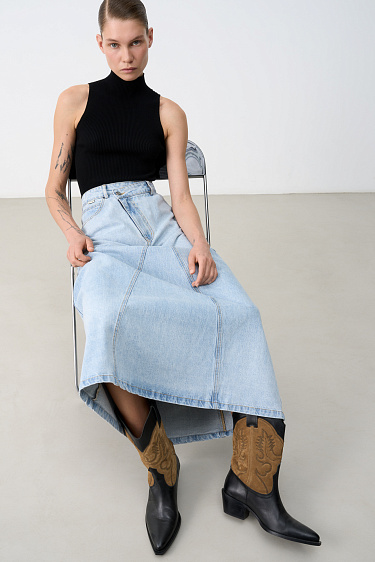 A top with a high collar emphasizes the shoulder line and visually lengthens the neck.