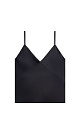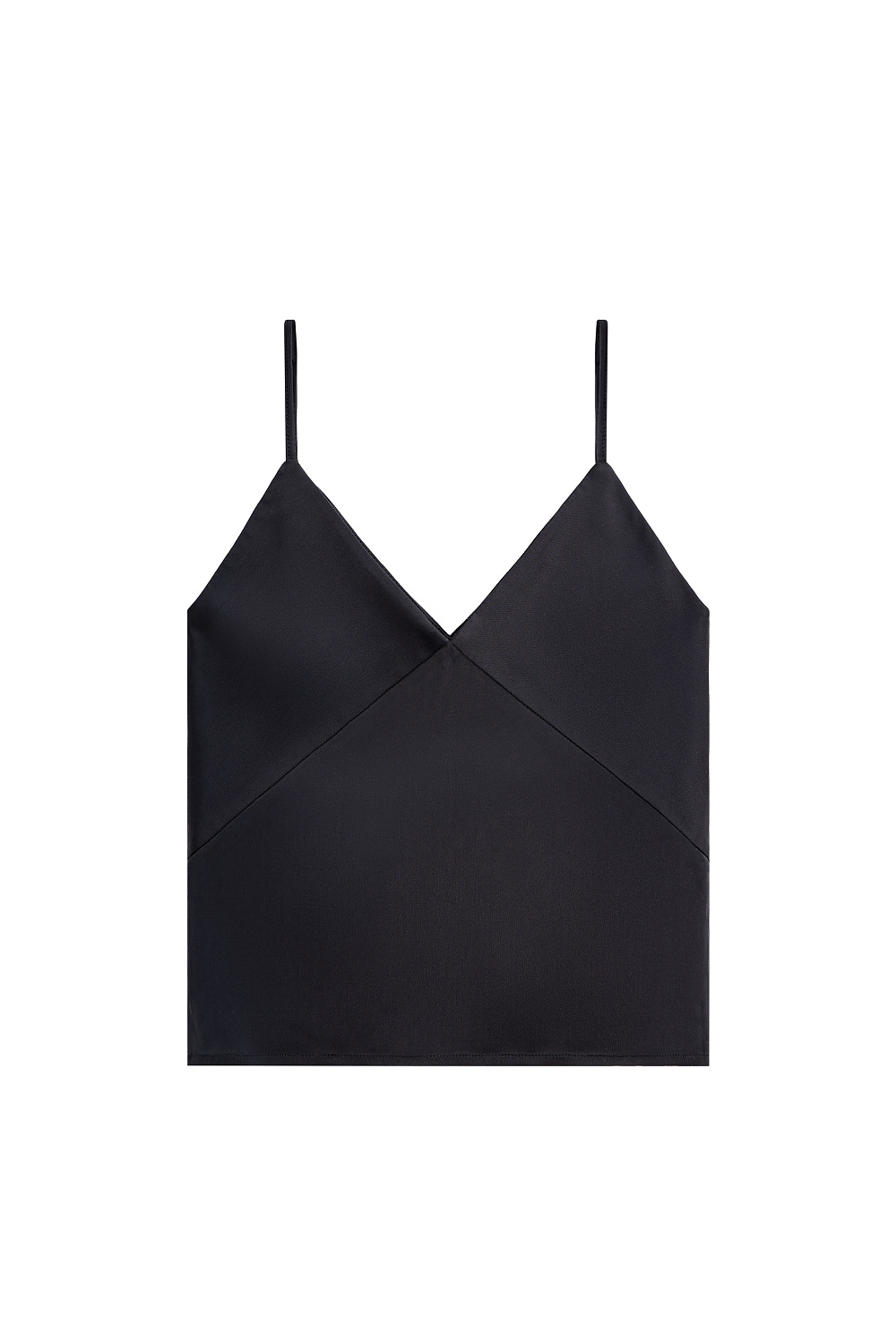 Satin top made of fine viscose. The model has a straight cut, thin straps and a deep V-neck.