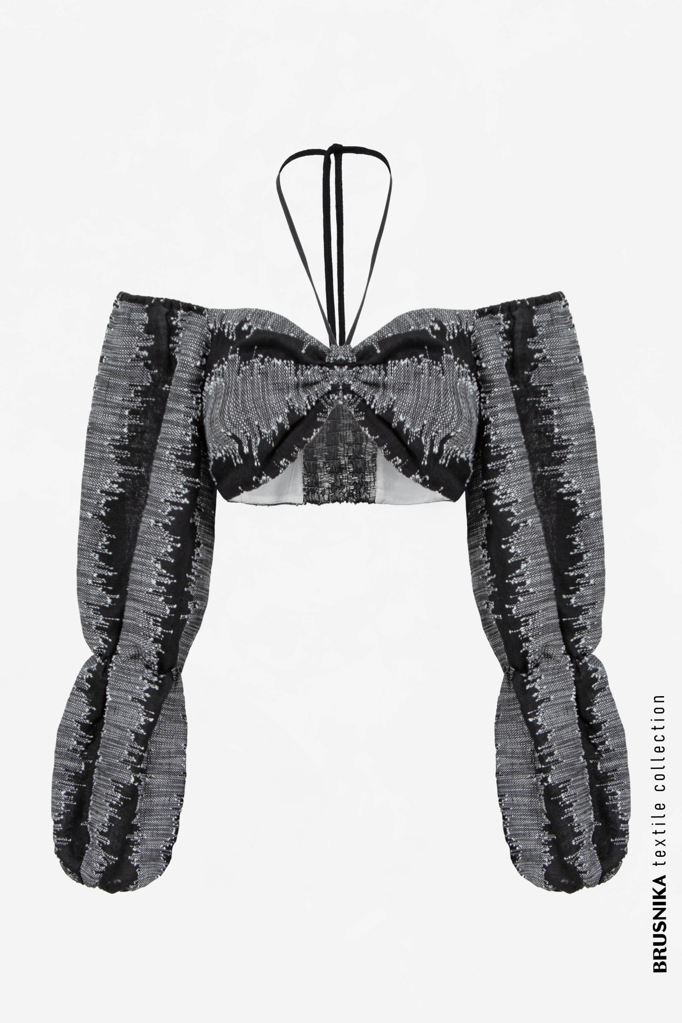 Short top made of 100% linen with a thin drawstring around the neck. Long puff sleeves.
