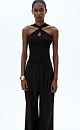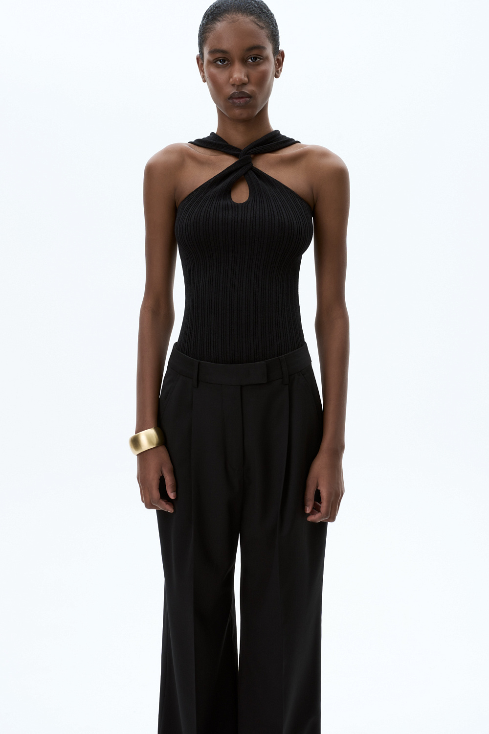 Knit top with double twist at the chest. Fitted silhouette with open shoulders.