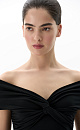 Modal top with open shoulder line. The model has a fitted silhouette and is sleeveless. The product is decorated with a twist on the chest and a drape on the bodice.