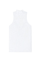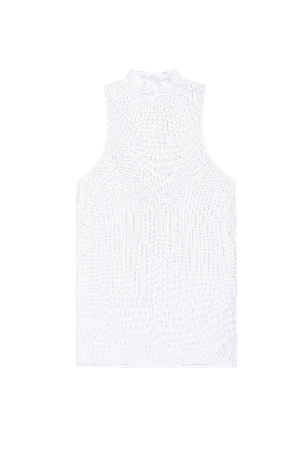 Knitted top made of cotton with the addition of viscose. A model with a high stand-up collar and a deep armhole. The collar of the product is made in fine ribbing.