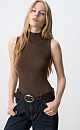 Viscose knit top. The model has a fitted silhouette, is sleeveless and has a low stand collar.