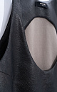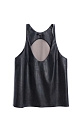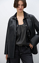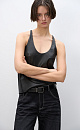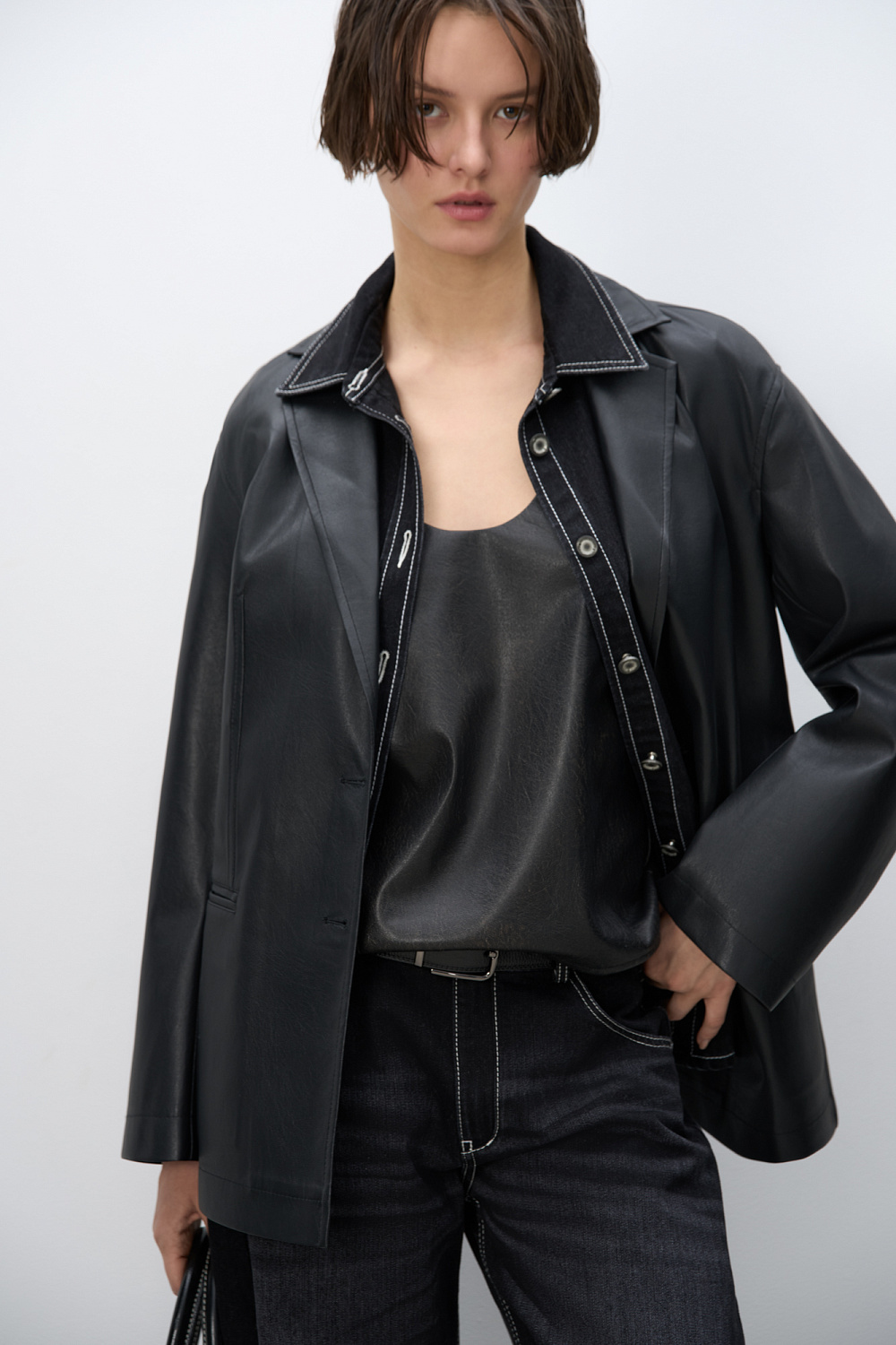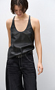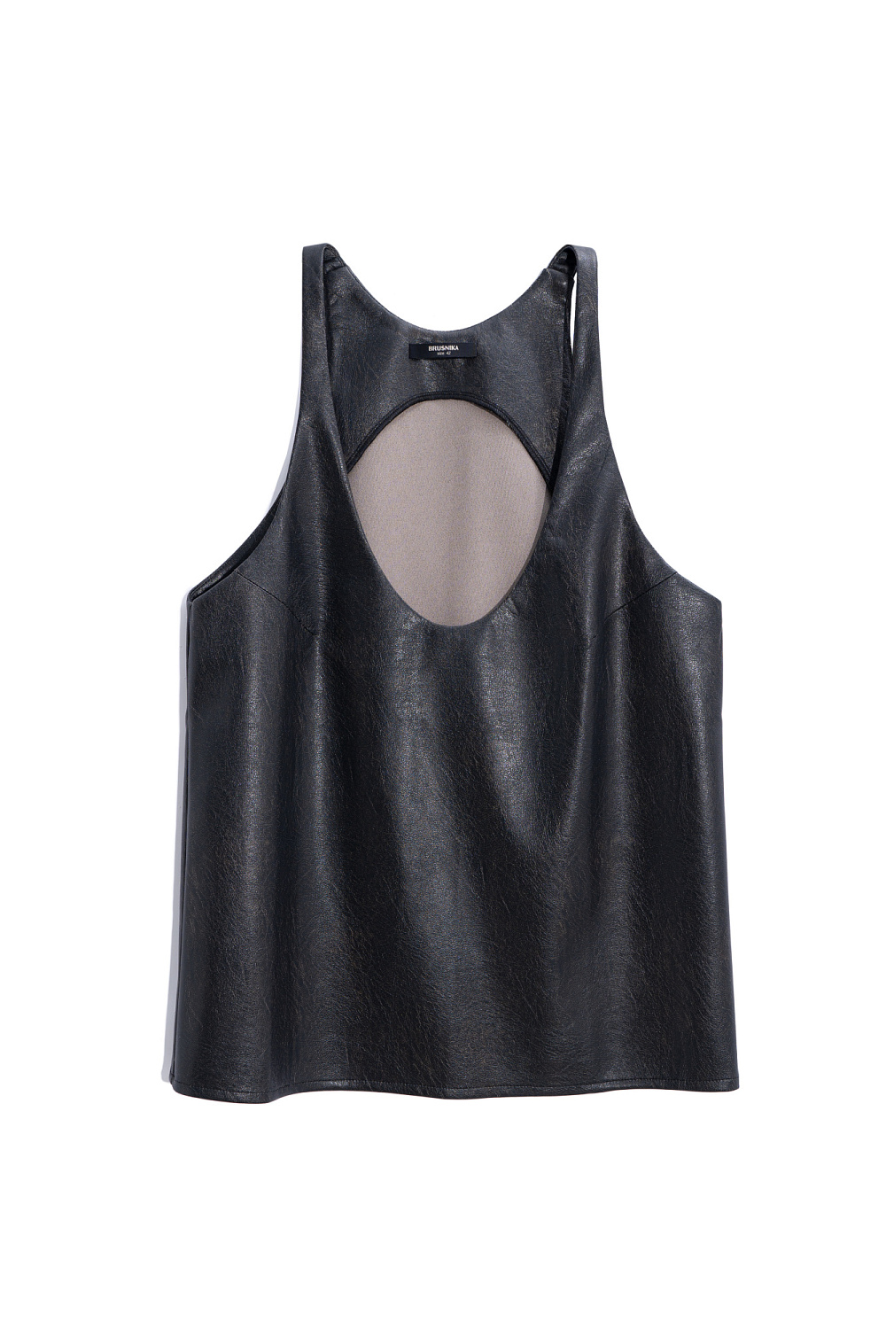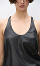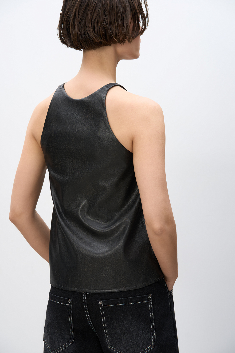 Textured eco leather top. The model has a loose silhouette with thin straps and a deep neckline.