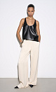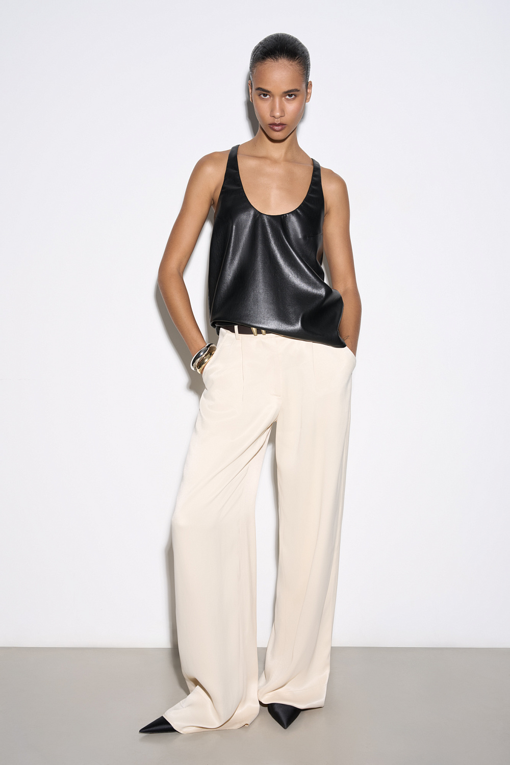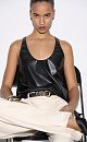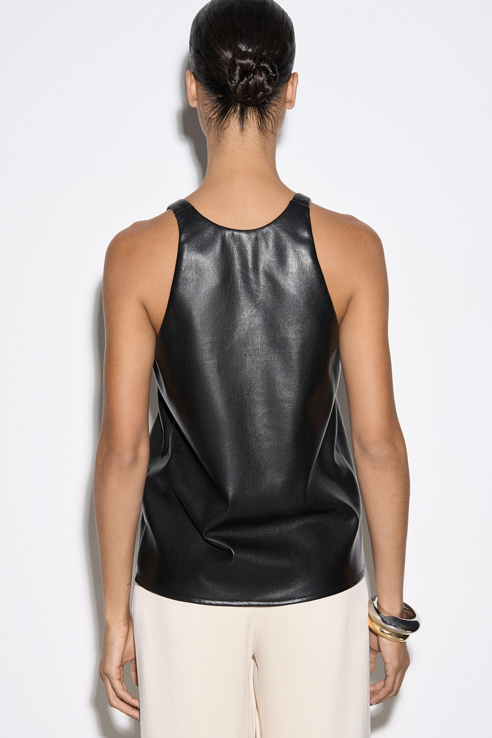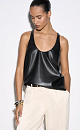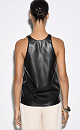 Textured eco leather top. The model has a loose silhouette with thin straps and a deep neckline.