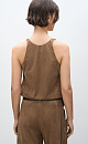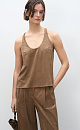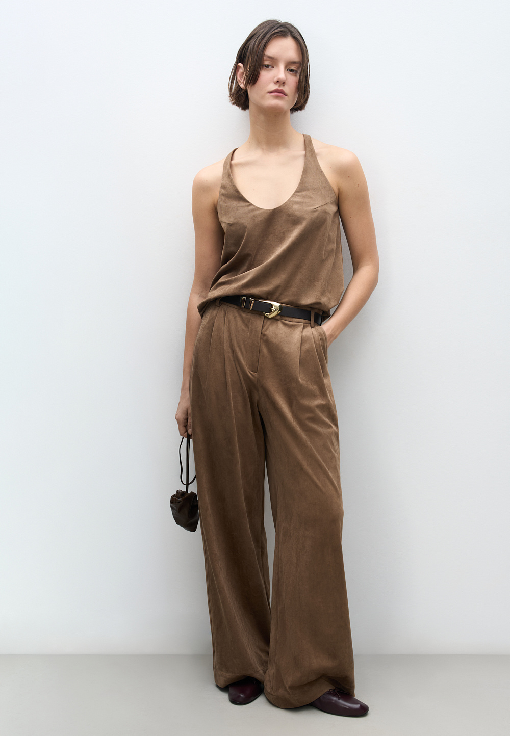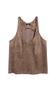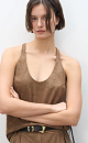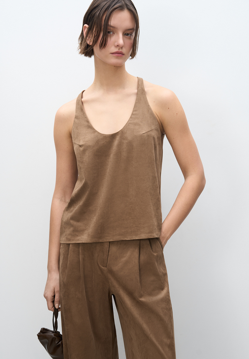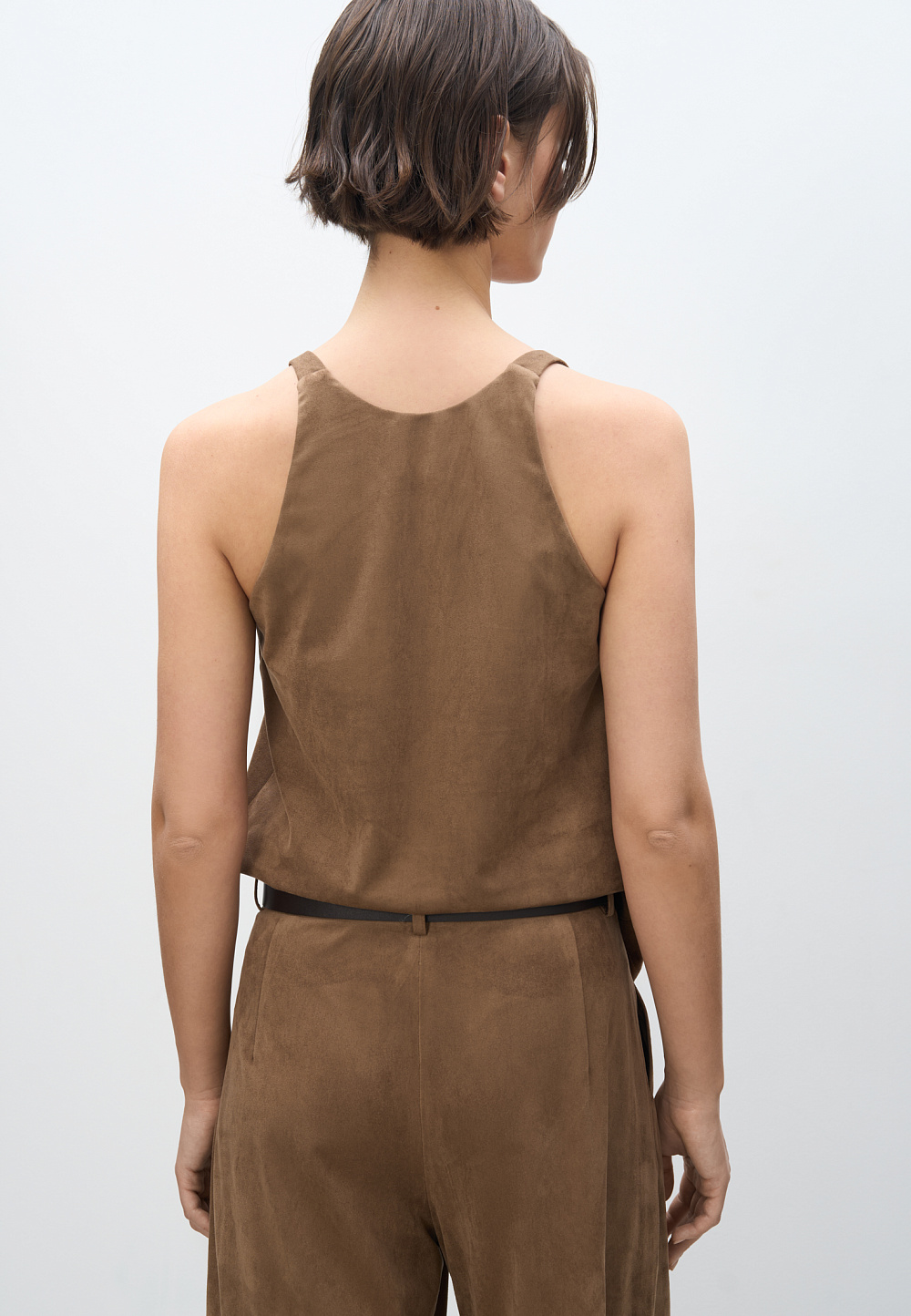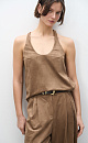 Top made of fabric with an imitation of the appearance and properties of natural suede. The model has a loose silhouette with thin straps and a deep neckline.