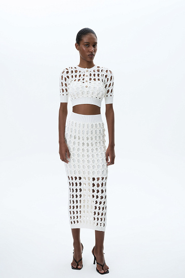 Knitted top with large openwork weave. Round neckline with button placket. Features wide textured elastic band on the sleeves and at the bottom. Includes top with thin straps.