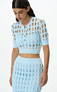 Knitted top with large openwork weave. Round neckline with button placket. Features wide textured elastic band on the sleeves and at the bottom. Includes top with thin straps.