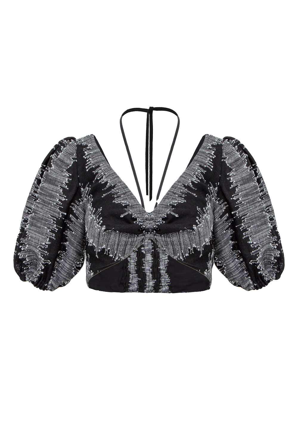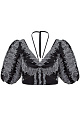 A short top of 100% texture flax. Model with a short sleeve-background, a deep neckline and a thin culus around the neck.