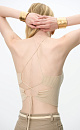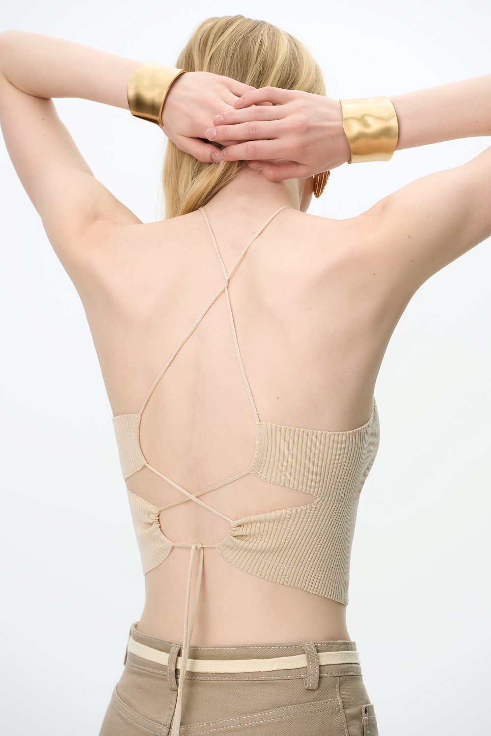 Ribbed viscose knit top. Open back with drawstring and thin straps.