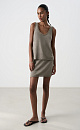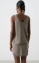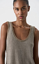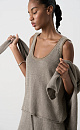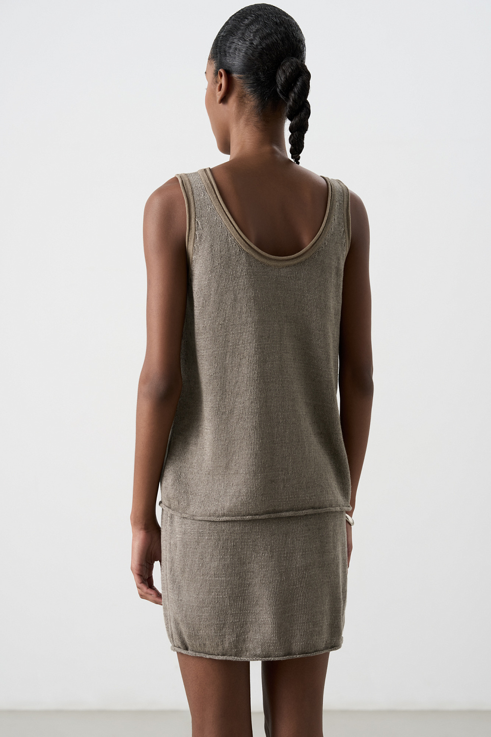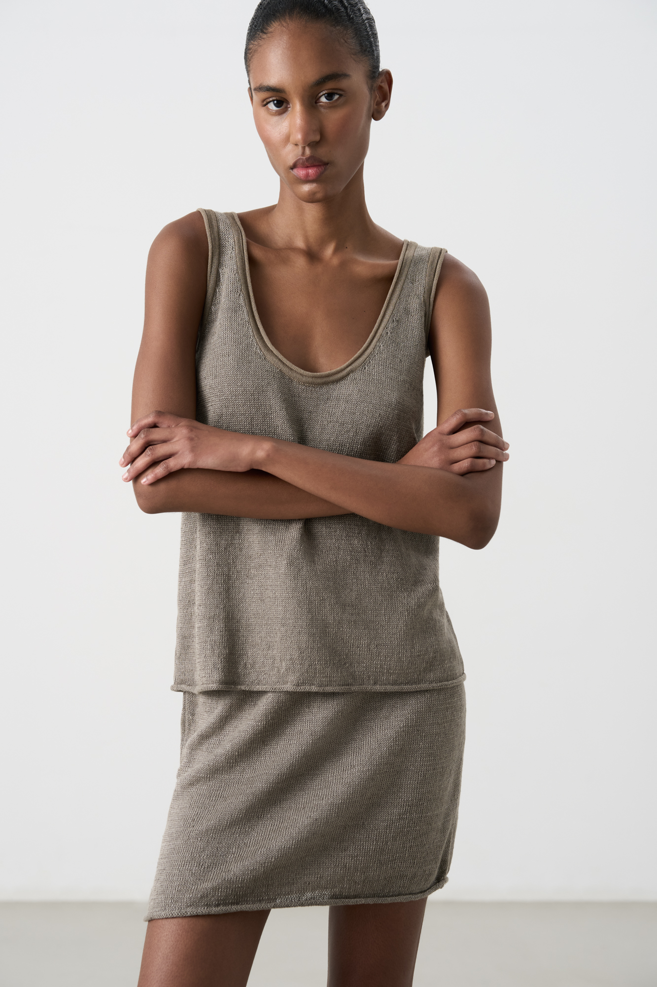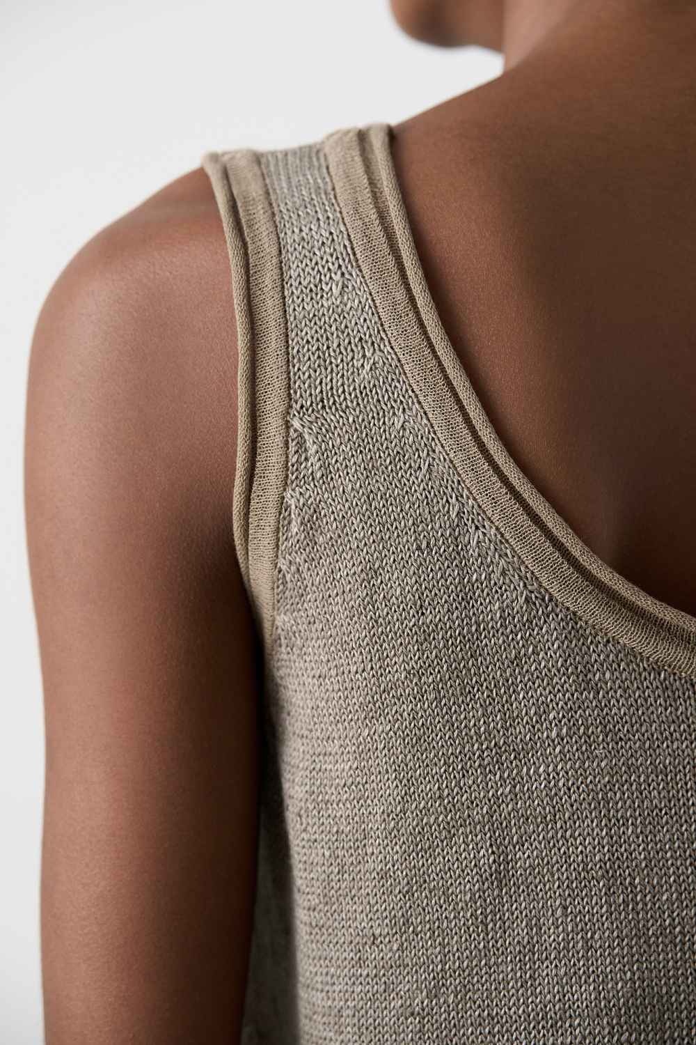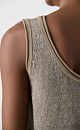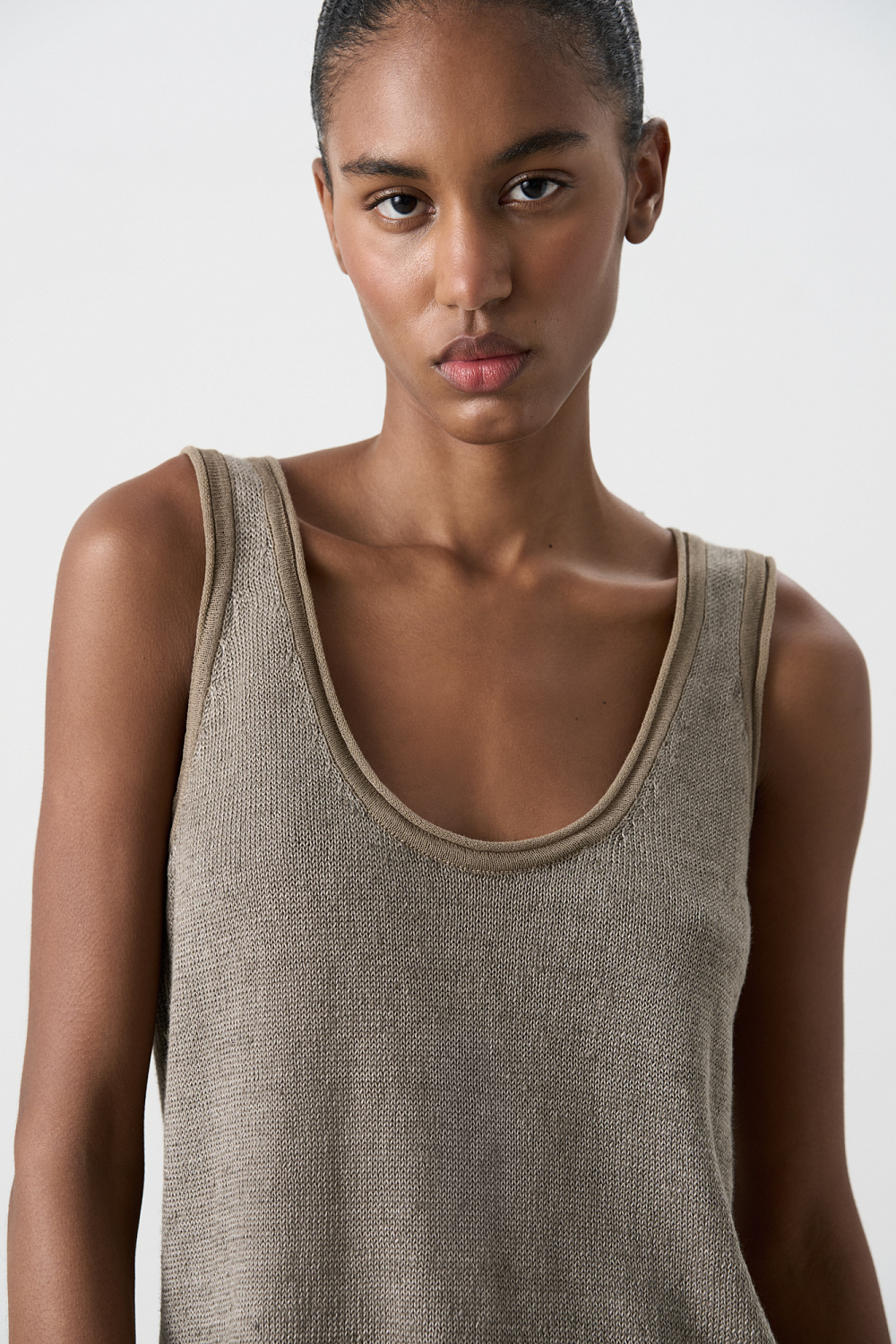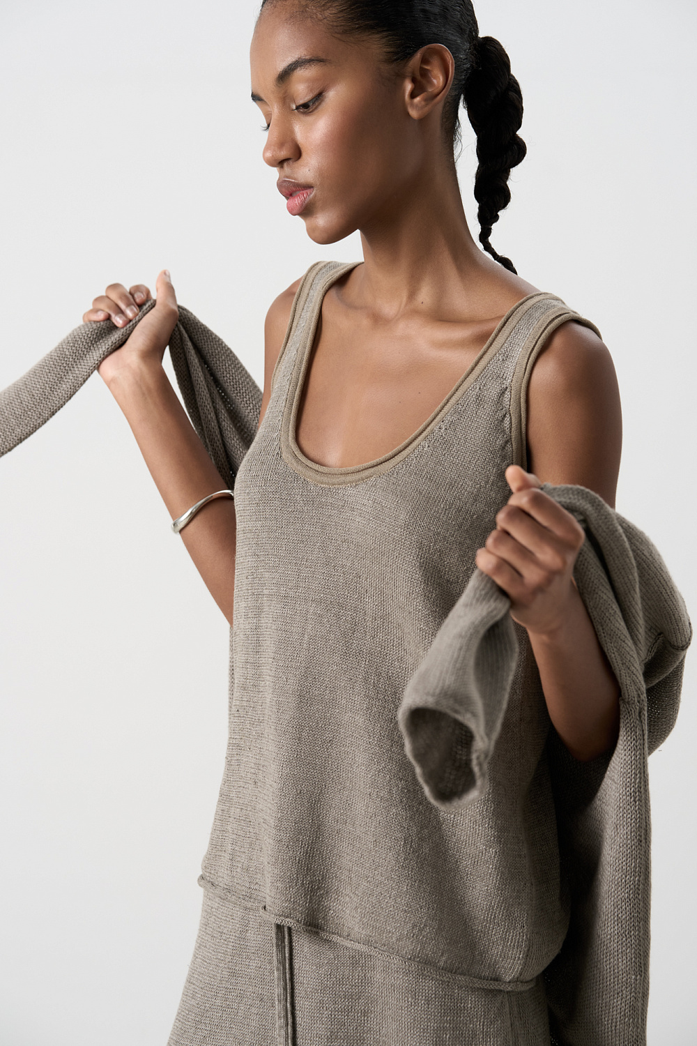 Knitted top made of 100% linen. The model has a straight cut, wide straps, a deep armhole and a U-shaped neckline. The edges of the product are ribbed.