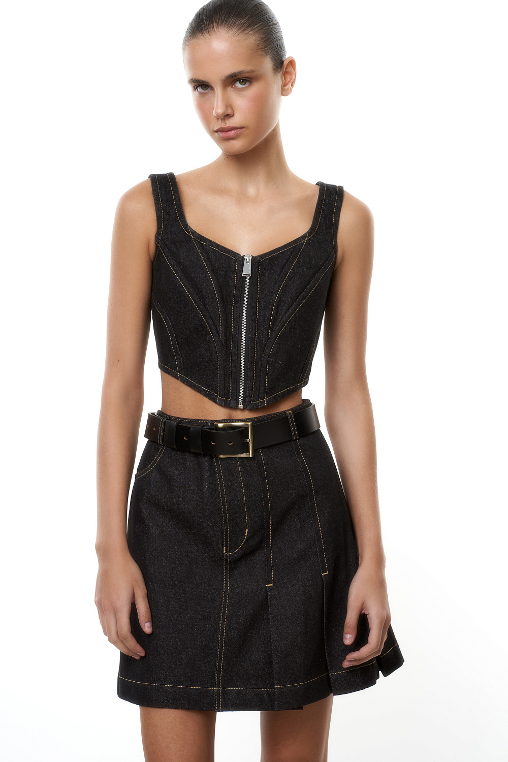 100% cotton denim corset with zip fastening and ribbon tie at the back. You can complement the look with jeans and a denim jacket.