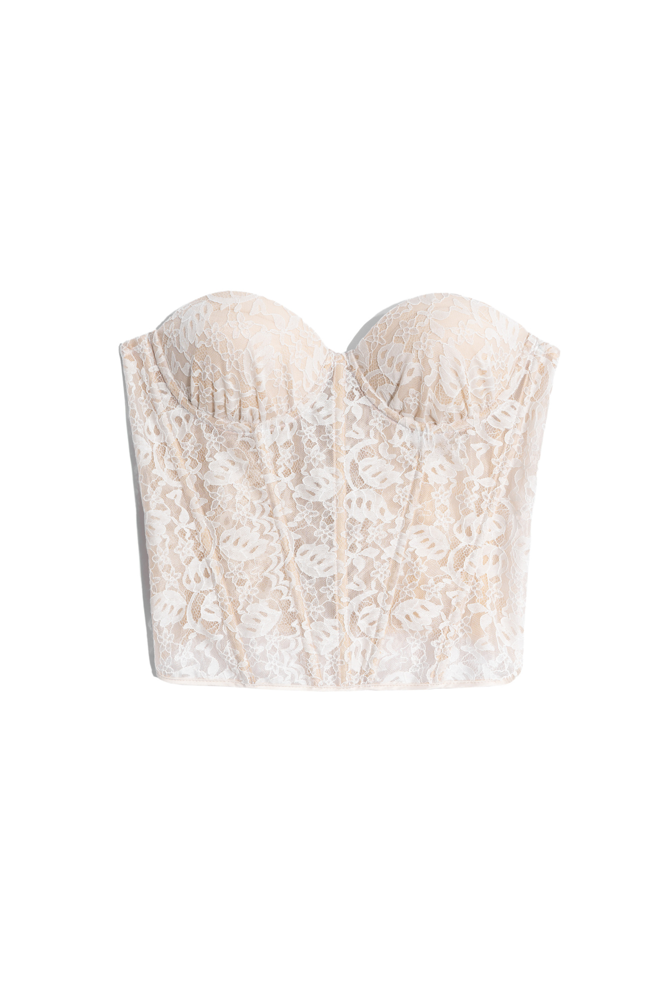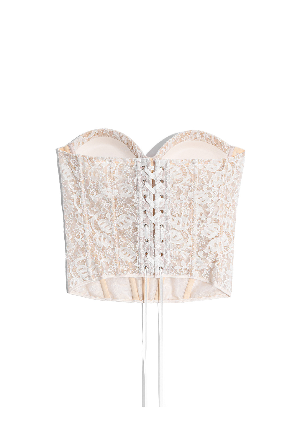 Corset made of thin lace with a flesh-colored lining. Model with cups and lacing on the back.