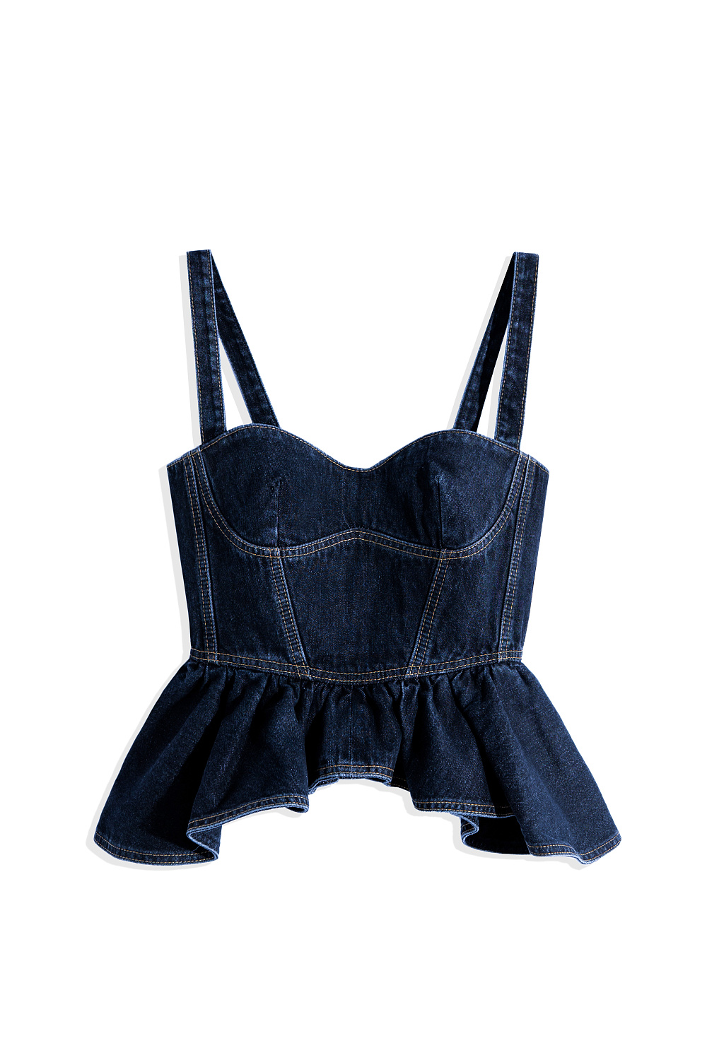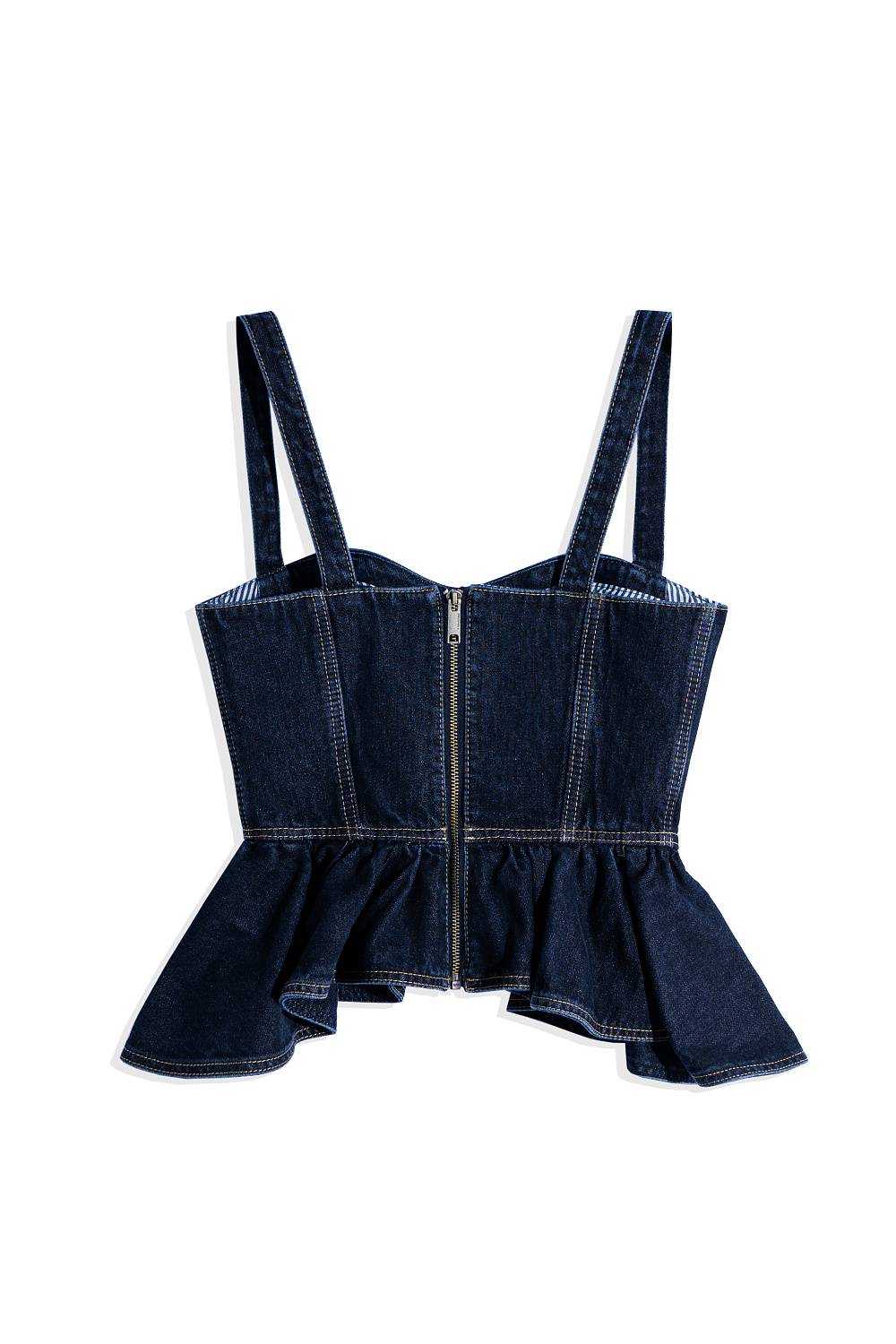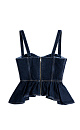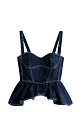 Denim top made of 100% cotton. The model has a fitted silhouette with wide straps, a figured bodice, accent stitching and a peplum. Zip fastening at the back.