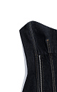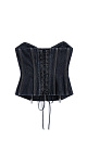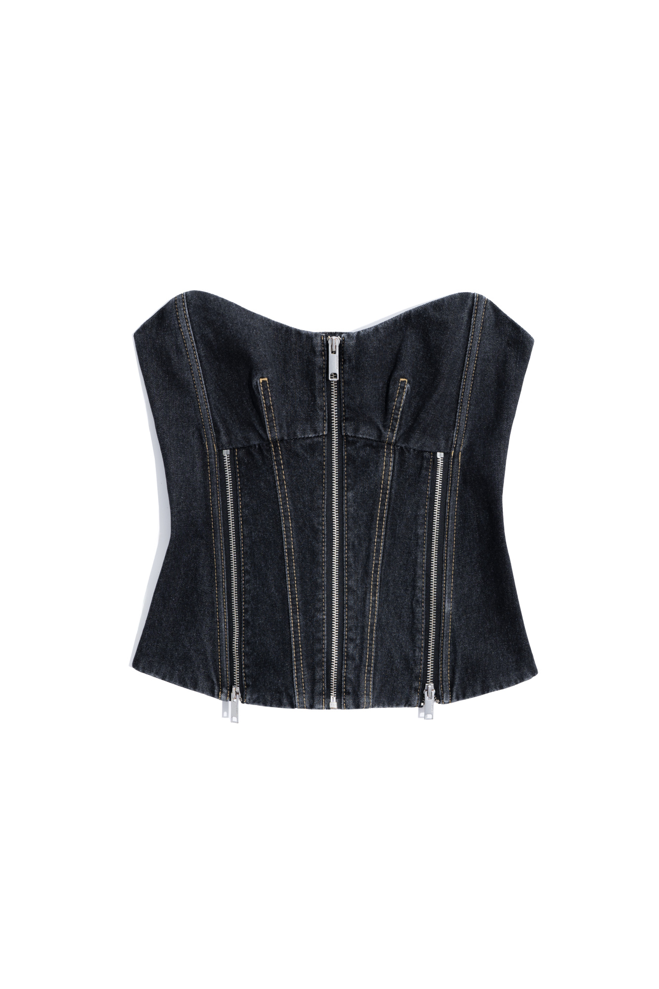 Denim corset made of 100% cotton. The model has a fitted silhouette with accent stitching and a zipper closure at the front. Lace-up back.
