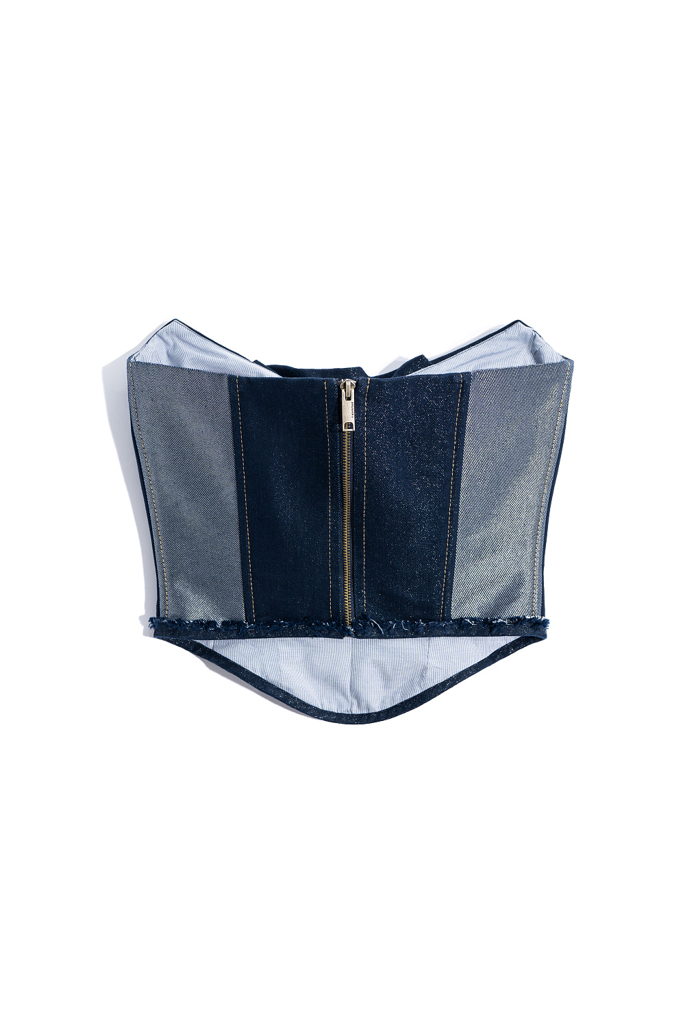 Denim corset with metallic thread. The model is strapless, with a figured neckline and voluminous decor. Zip closure.