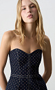 Printed denim corset made of 100% cotton. The model has a textured bodice and a flared silhouette. The product is decorated with a contrasting stitching. You can complement the look with a skirt in the same style.