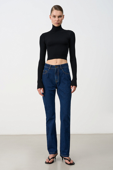 Denim corset made of 100% cotton. The model has a fitted silhouette with accent stitching and a zipper closure at the front. Lace-up back.