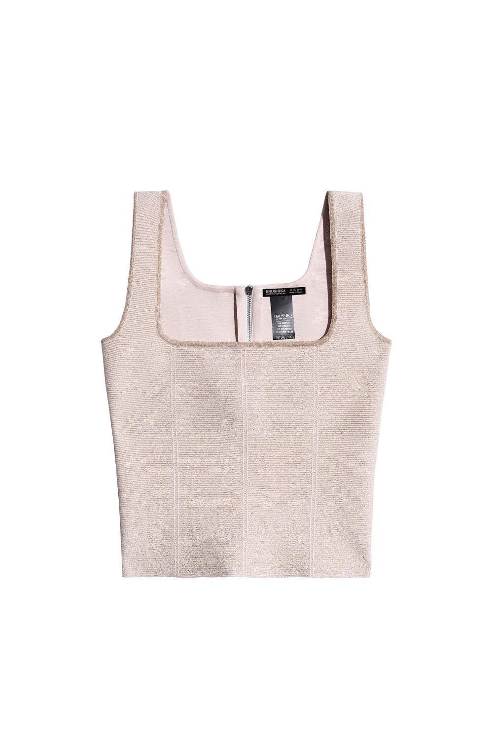 Short viscose knitted corset with luster. The model has a fitted silhouette, a square neckline and wide straps. It is fastened with a zipper at the back.