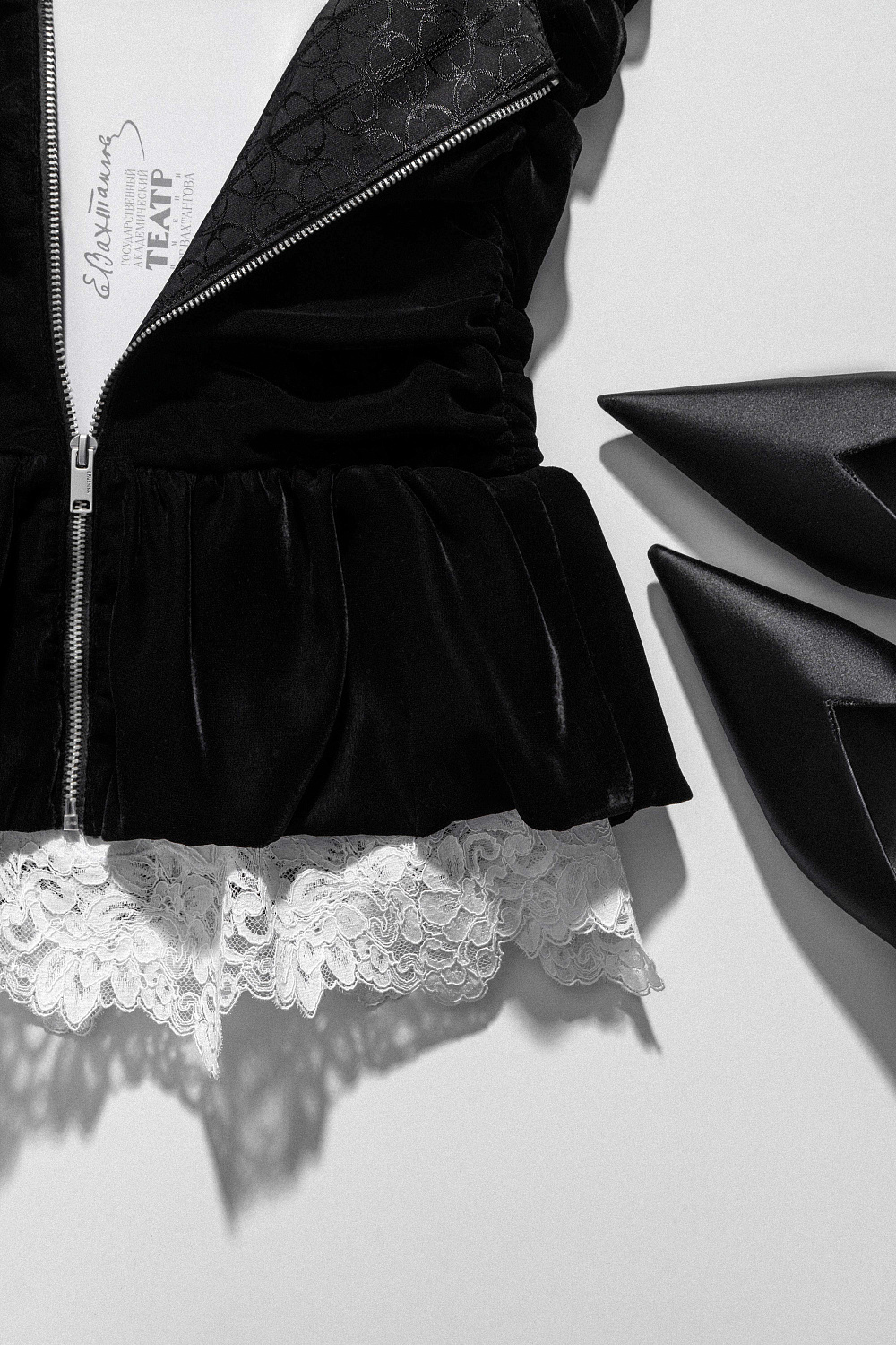 Velvet corset decorated with drapery and peplum. Fitted silhouette with zip fastening at the back. The product is lined.