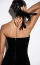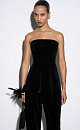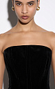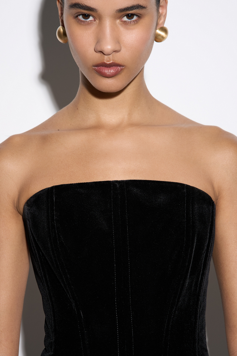 An elongated velvet corset. A fitted silhouette model with a hidden zipper at the back. The product is lined.