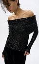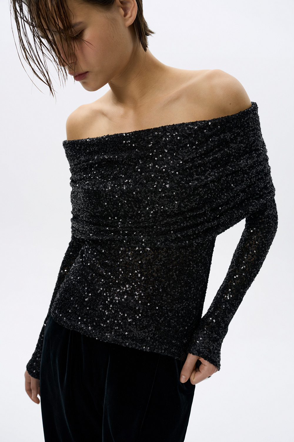 Top with sequins. Fitted silhouette with long sleeves and open shoulders. The product is lined.