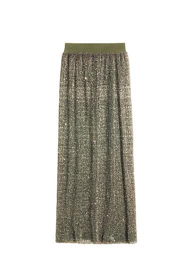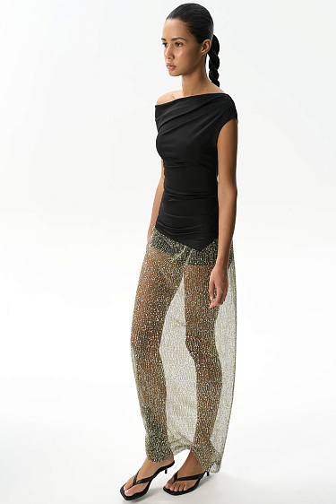 A transparent sleeveless top with a round neckline. The model is decorated with sequins.