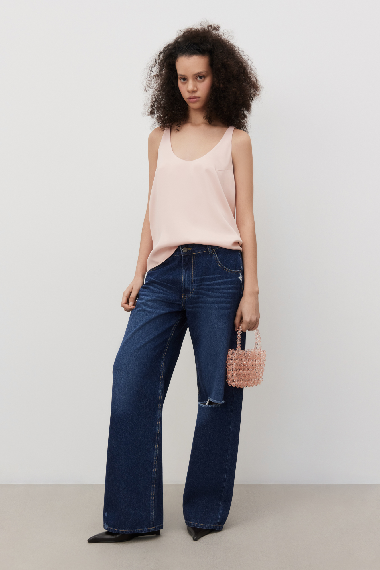 T-shirt made of satin viscose. The model has a loose silhouette with thin straps and a deep neckline.