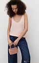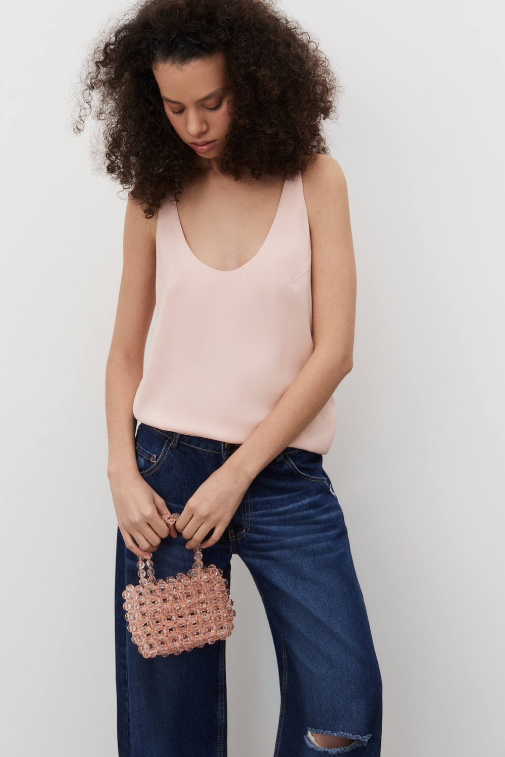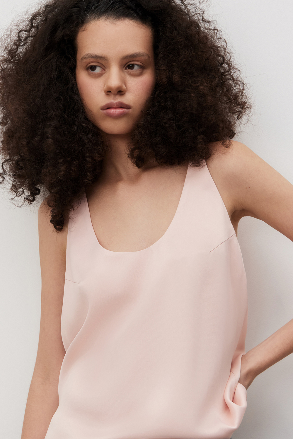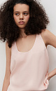 T-shirt made of satin viscose. The model has a loose silhouette with thin straps and a deep neckline.