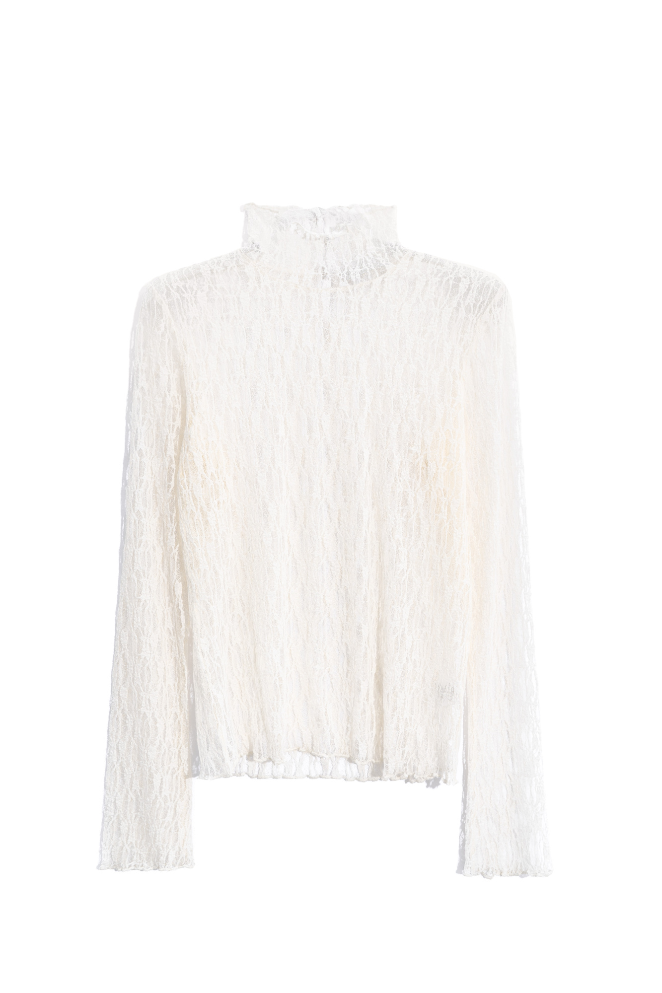 Translucent lace top. Model with long sleeves flared to the cuffs and a stand-up collar with buttons. The product is unlined.