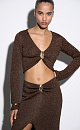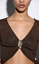 Knitted top made of viscose with lurex. The model features a cropped silhouette with long sleeves, rolled cuffs, a deep V-neckline and an accent detail on the bodice.