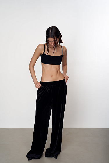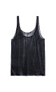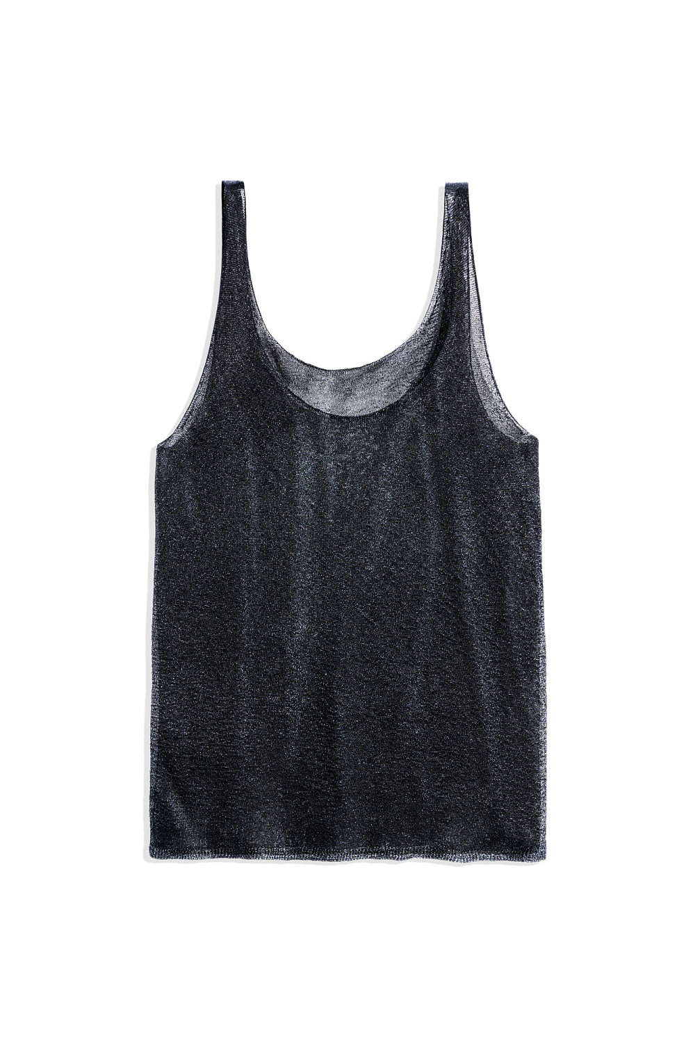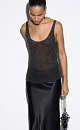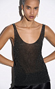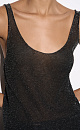 Translucent one-piece knitted T-shirt made of viscose with the addition of lurex. The model has a loose silhouette with thin straps and a deep neckline.